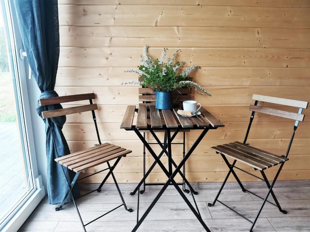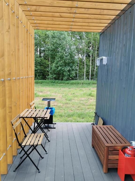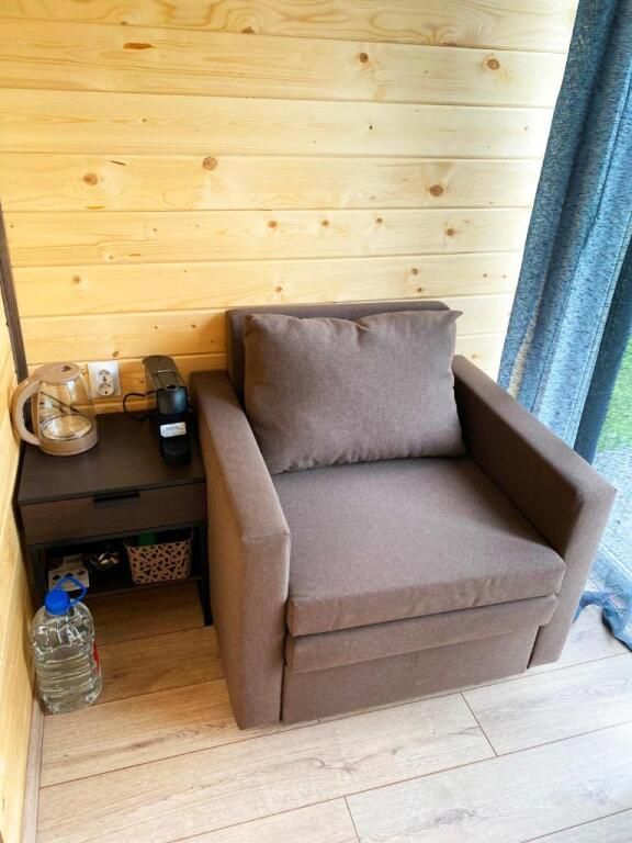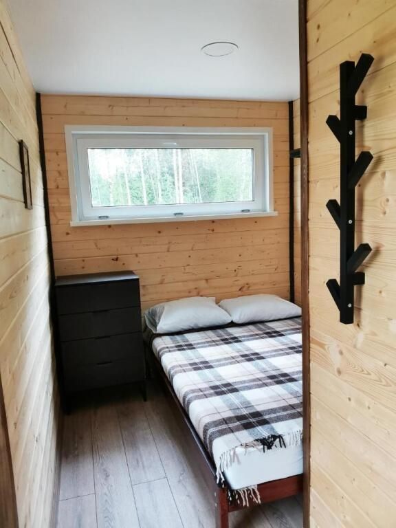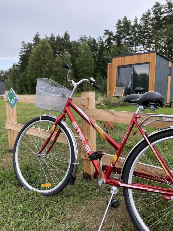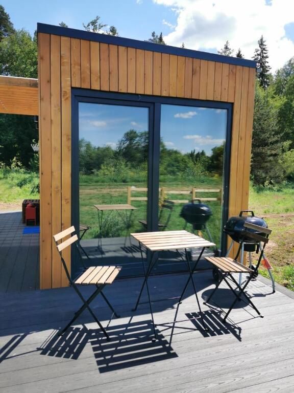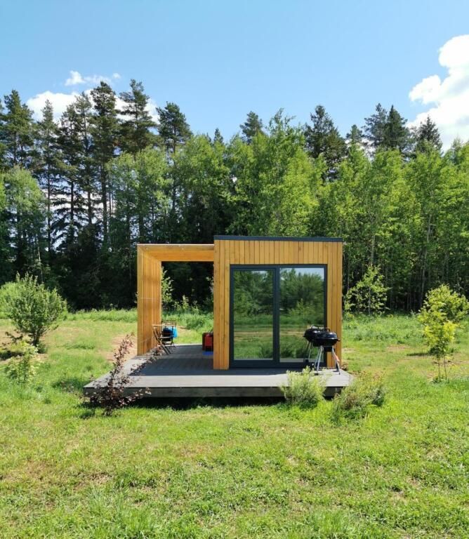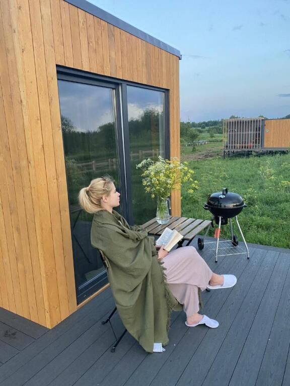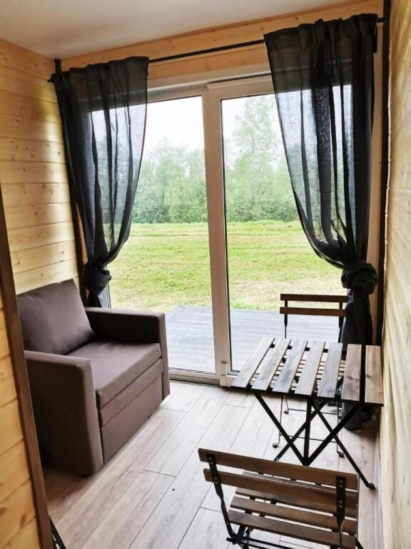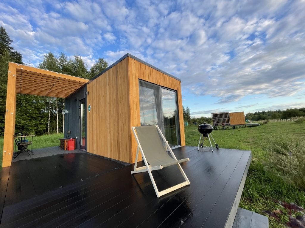 Отдельностоящий компактный двухместный Глэмп-домик с двуспальной кроватью и собственной верандой с панорамными окнами в 10 метрах от реки. Возможно размещение втроем - гостиная оборудована раздвижным креслом. Санузел оборудован душевой кабиной и феном. Домик укомплектован садовой мебелью, барбекю и играми. Из панорамных окон открывается шикарный вид на речку и закат. Идеально подходит для рыбаков и семейных пар с одним ребенком.