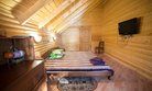 VIP-коттеджи представляют собой 2-х этажные дома, на первом этаже которых находится каминный зал с настоящим камином, который топится дровами, столовая, оборудованный караоке, DVD, спутниковым телевидением, микроволновой печью, холодильником, чайником и всей необходимой посудой.