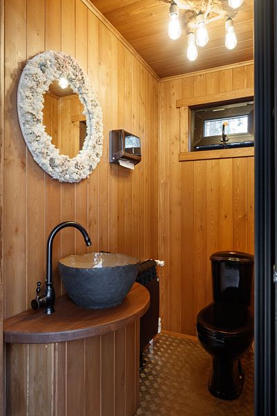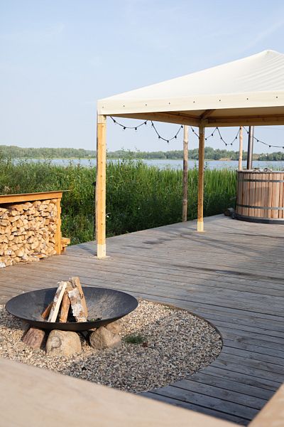 Домик выполнен из утепленного дышащего материала: летом в нем свежо, а зимой — тепло, т.к. стоит регулируемый круглосуточный обогрев до +31С. Внутри все необходимое для беспечного отдыха: гардеробный шкаф, комфортные кровати с электропростынями, двухместный диван, холодильник, турка, кухонные и гигиенические принадлежности, обогреватель и биотуалет. Рядом с каждым домиком есть мангальная площадка и садовая мебель, есть купель.