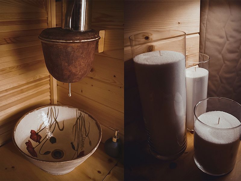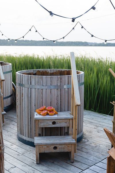 Рядом с баней расположены купели. Можно выбрать горячую или холодную купель: чтобы расслабиться или, наоборот, взбодриться. Пользоваться купелью можно и зимой, и летом - в них всегда поддерживается комфортная температура 38-40 °C. В купель можно добавить ветки пихты или ели по желанию.