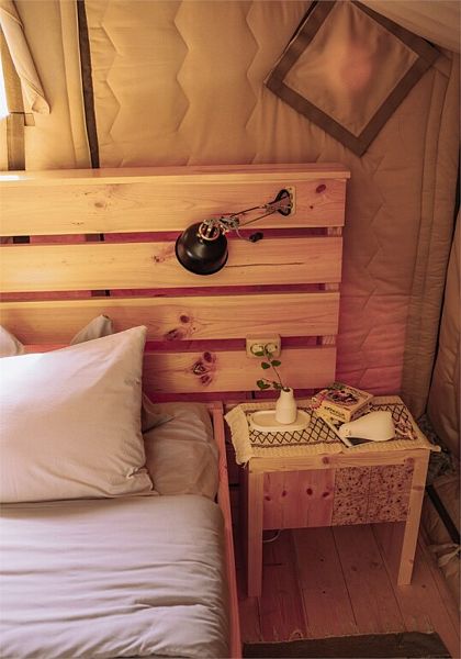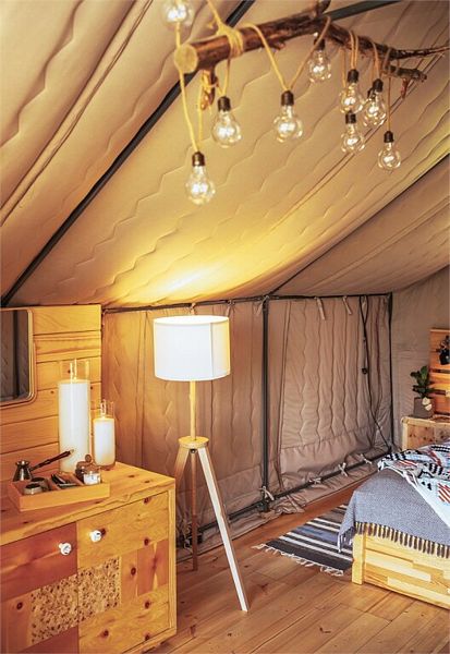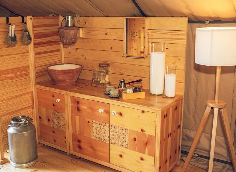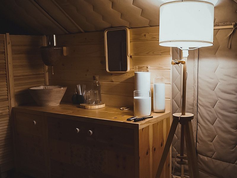 Домик выполнен из утепленного дышащего материала: летом в нем свежо, а зимой — тепло, т.к. стоит регулируемый круглосуточный обогрев до +31С. Внутри все необходимое для беспечного отдыха: гардеробный шкаф, комфортные кровати с электропростынями, двухместный диван, холодильник, турка, кухонные и гигиенические принадлежности, обогреватель и биотуалет. Рядом с каждым домиком есть мангальная площадка и садовая мебель.