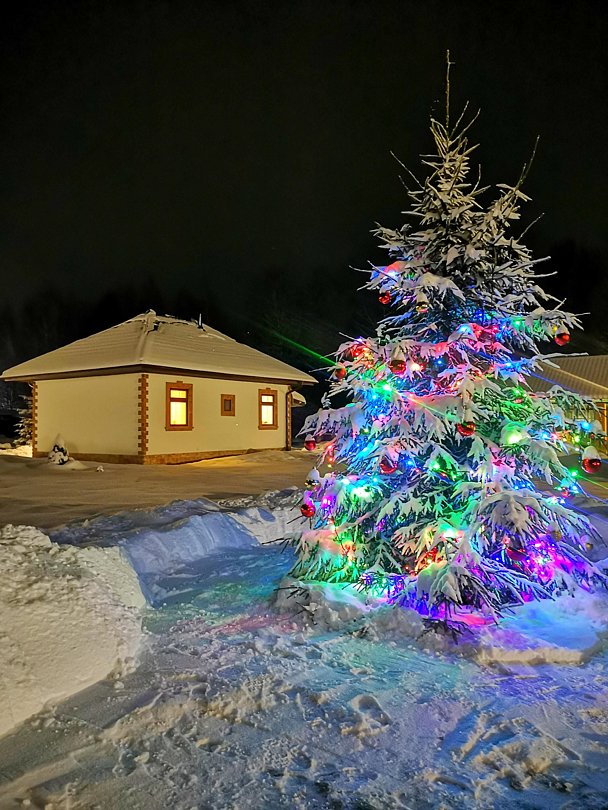 Новогодняя программа (31.12.25 - 1.01.26): фуршет, Дед Мороз, подарки детям и уличный кинотеатр.