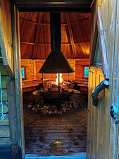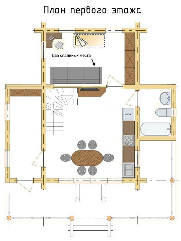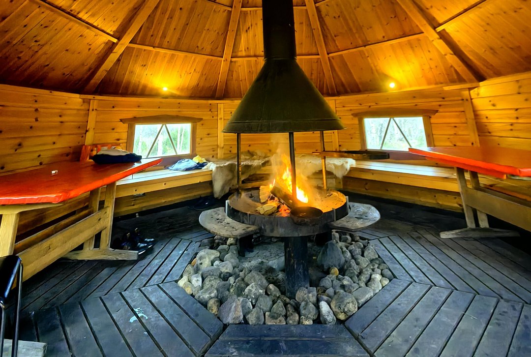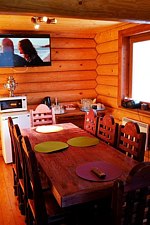 Внутри домика имеется все необходимое для комфортного отдыха и приготовления еды на огне: печь-барбекю с дымоходом, набор посуды и столовых приборов, стол со стульями и даже небольшая зона отдыха.