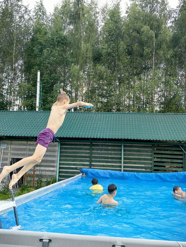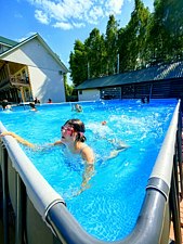 В непосредственной близости к базе отдыха имеется песчаный пляж с деревянным причалом, с которого можно попрыгать в воду.