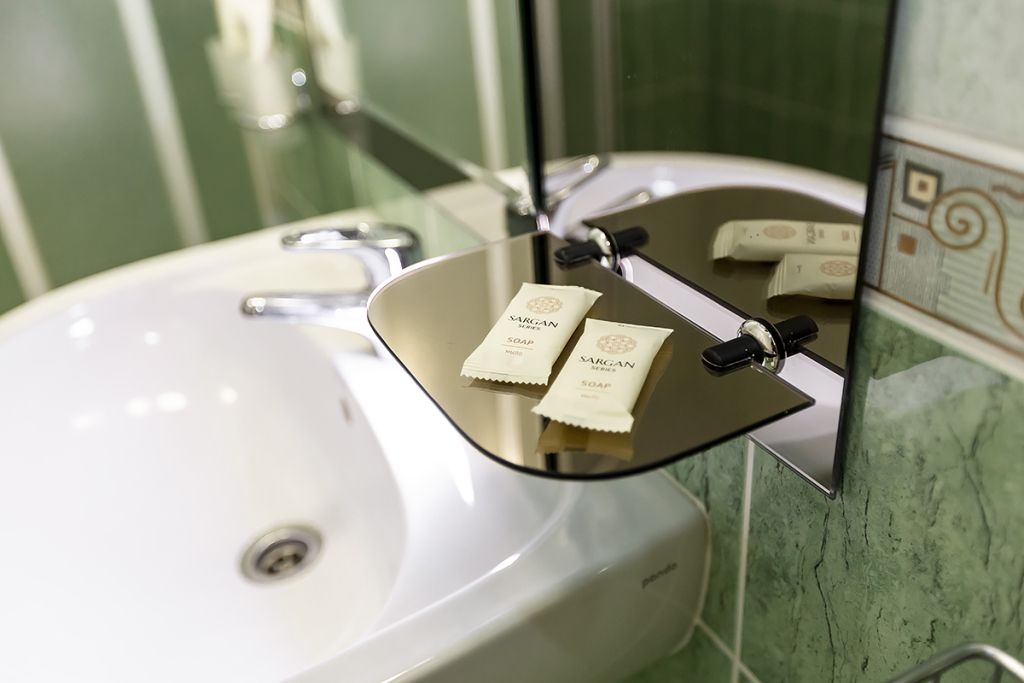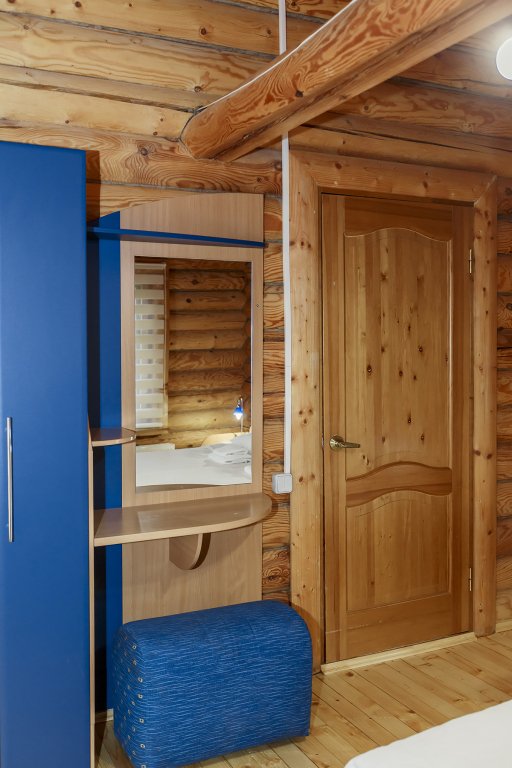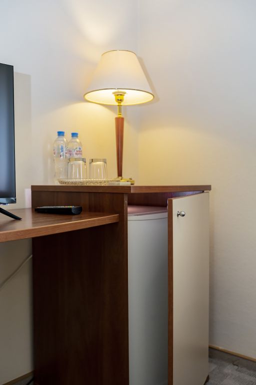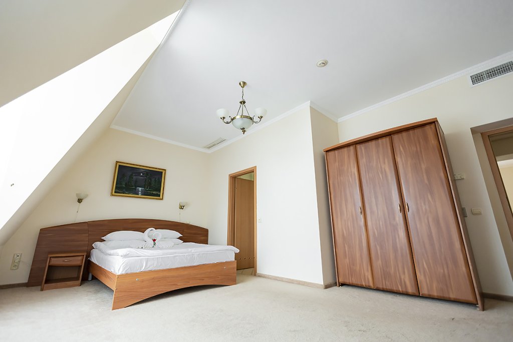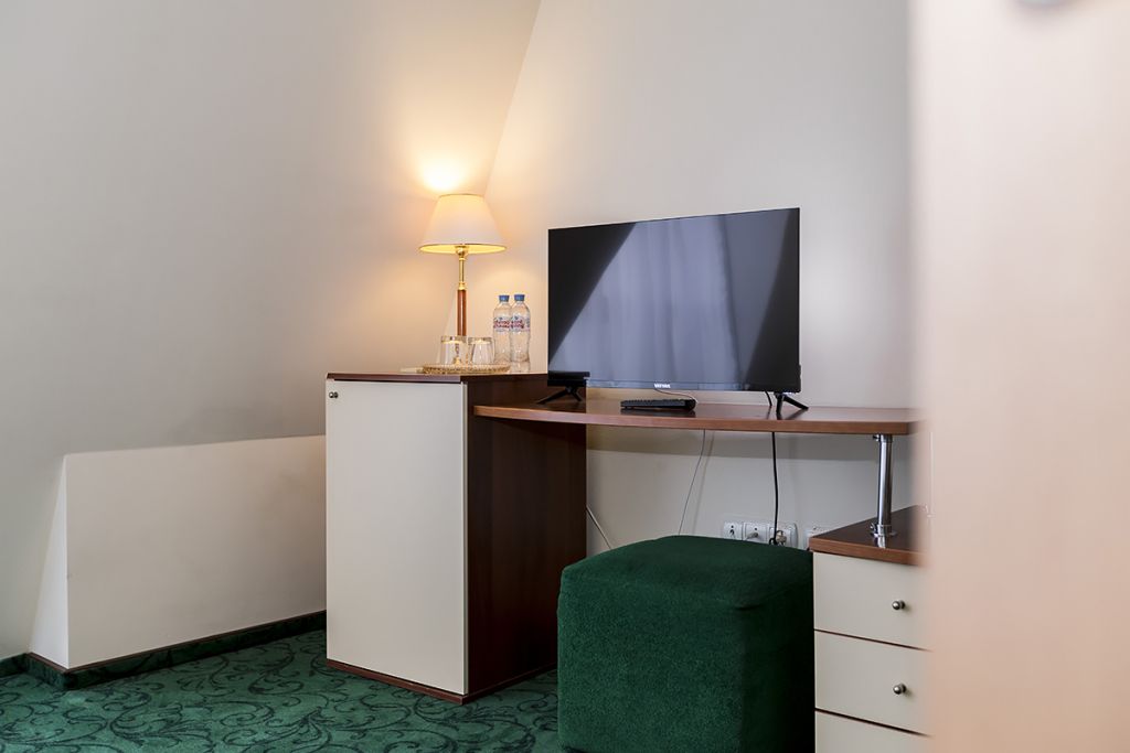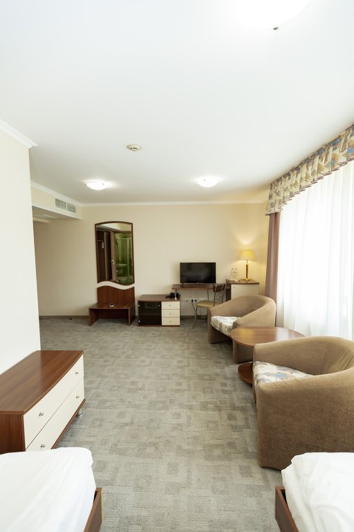 В номере: двуспальная кровать 145*200 см, ТВ, холодильник, сейф, одно кресло, рабочий стол, журнальный стол, настольная лампа, зеркало, кондиционер, система радиотрансляции, телефон.