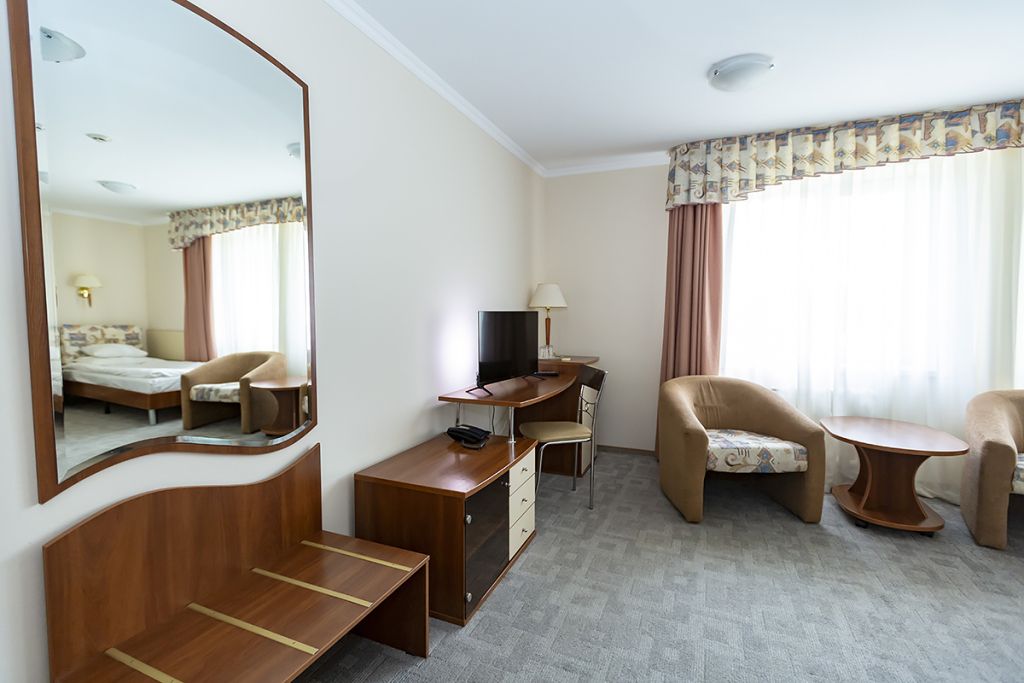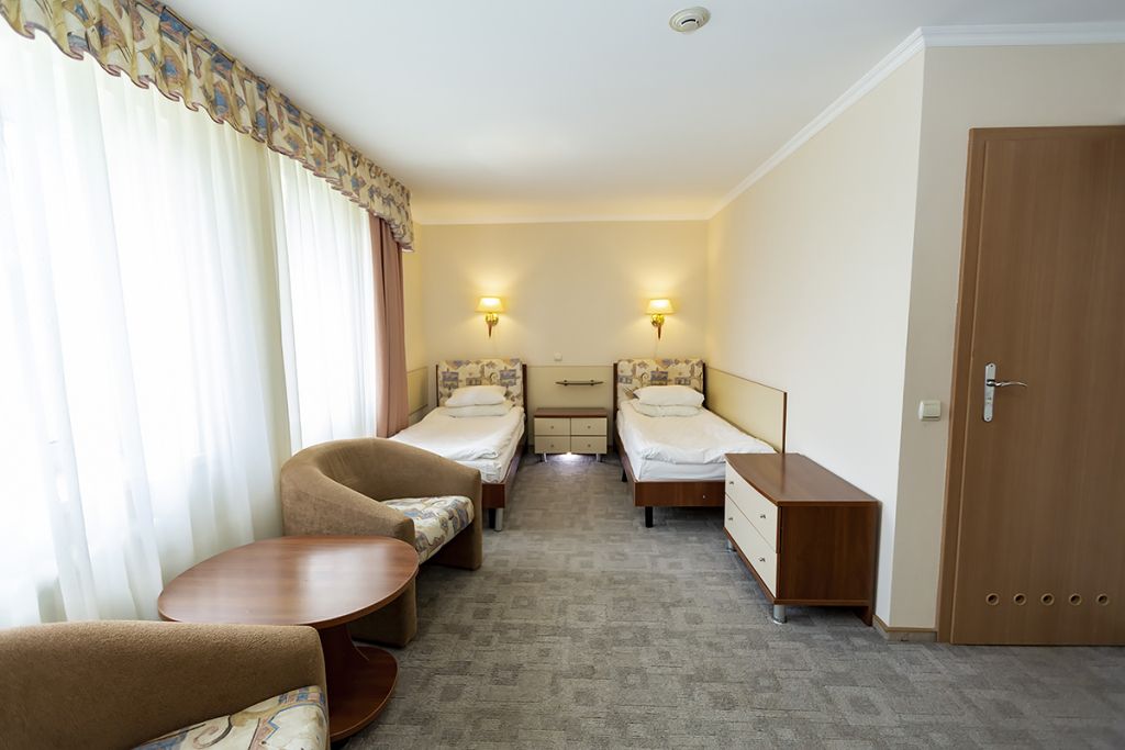 В номере с раздельными кроватями: две односпальные кровати 90*200 см, ТВ, холодильник, сейф, два кресла, журнальный стол, прикроватная т умбочка, зеркало,