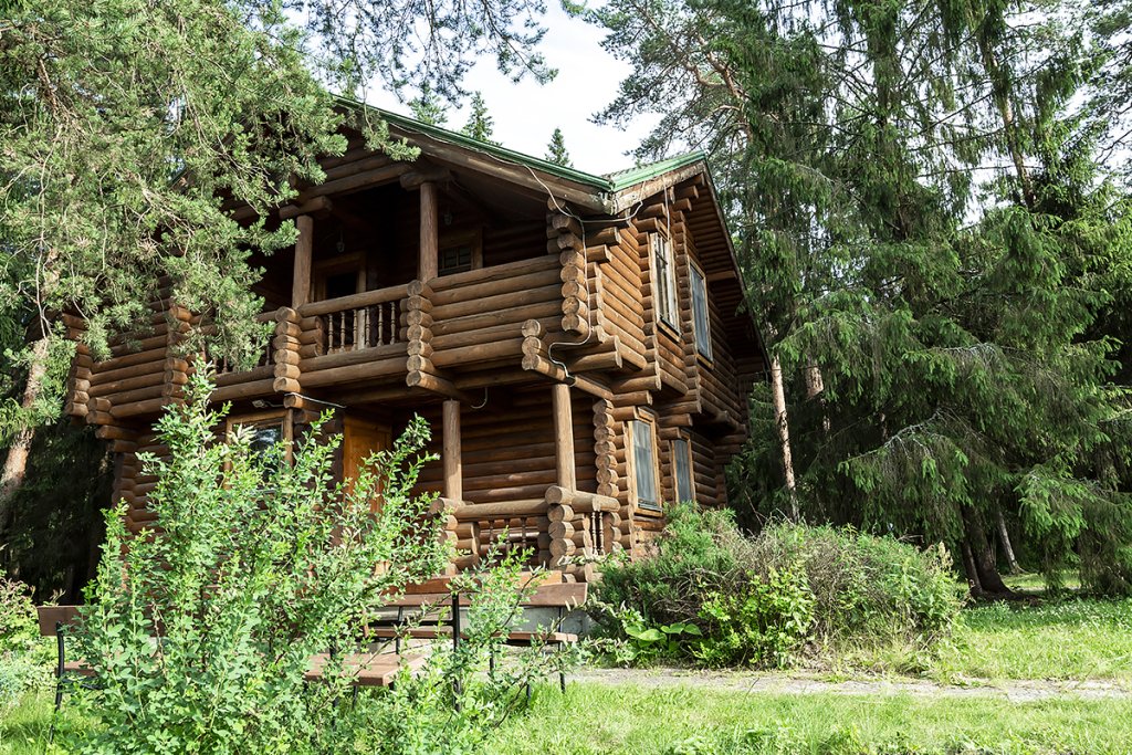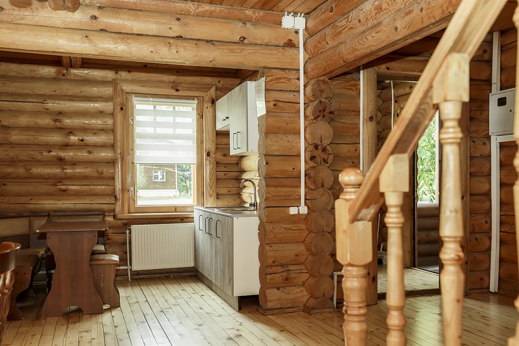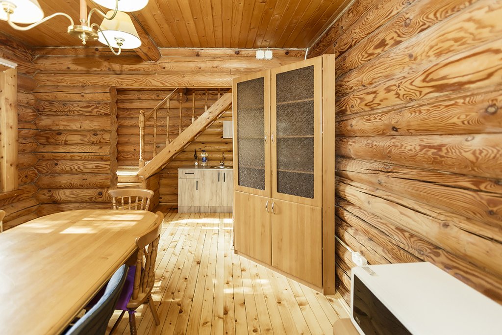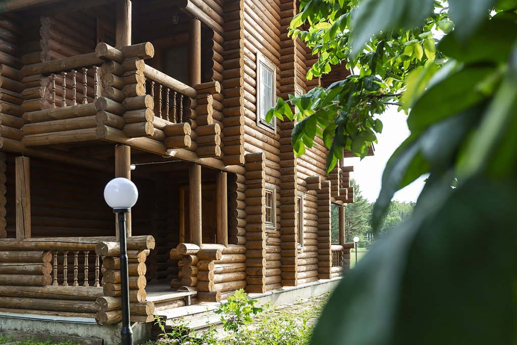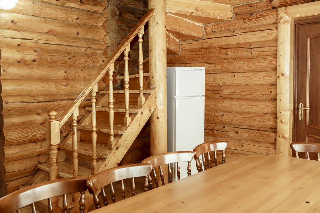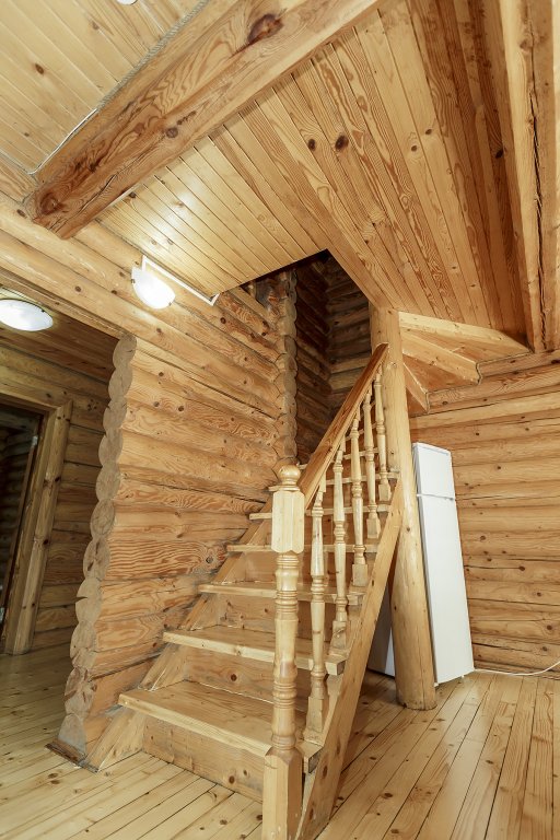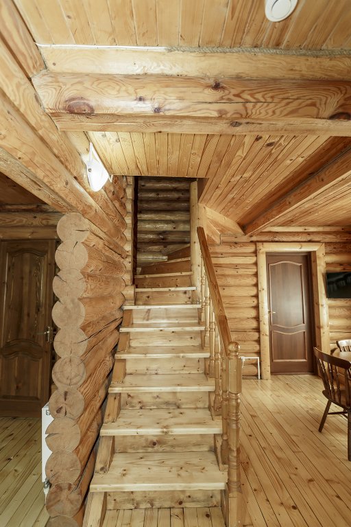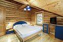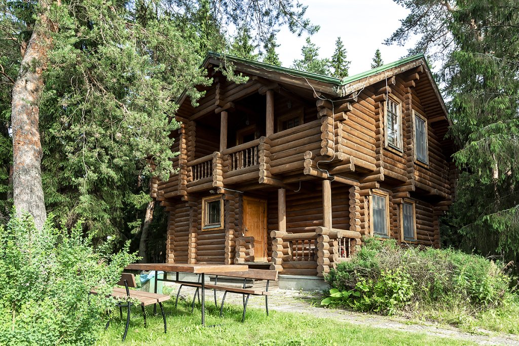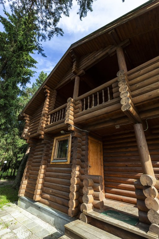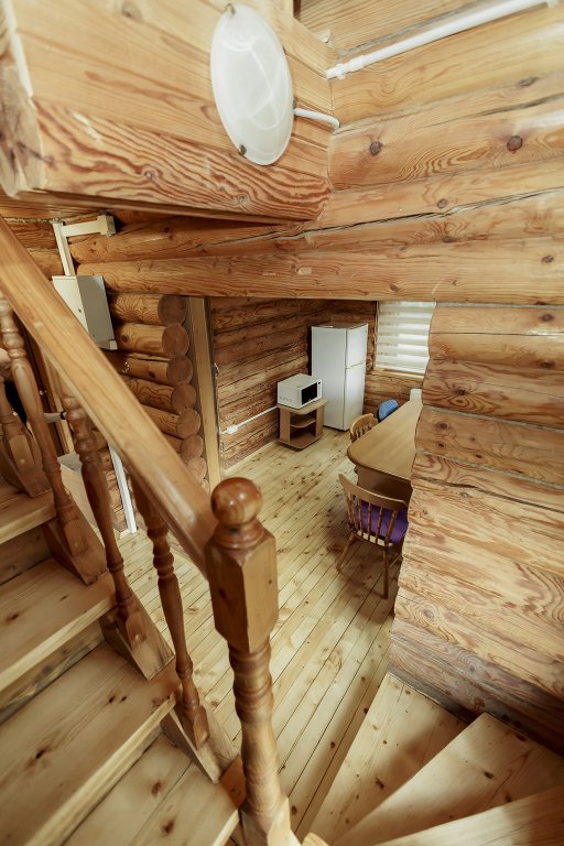 Деревянный коттедж из двух этажей с балконом, рассчитанный на 6-10 человек. В доме имеется кухня, два холла, два санузла, три спальни и балкон.