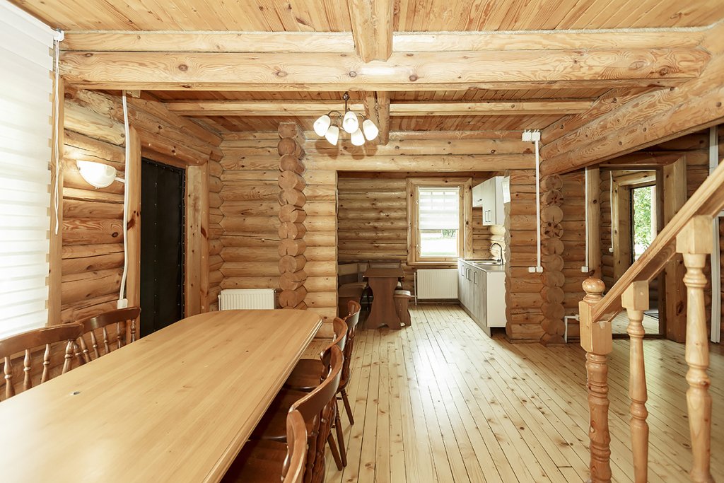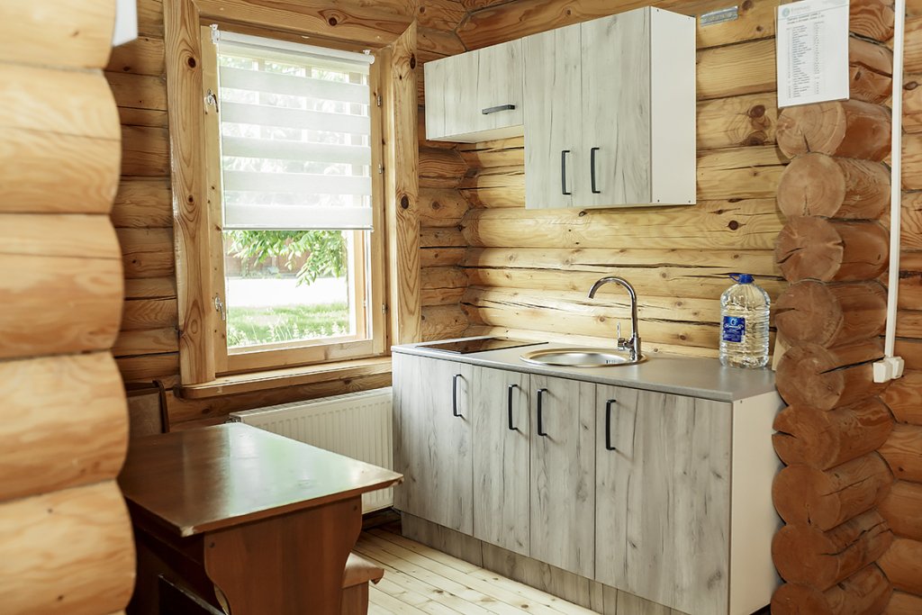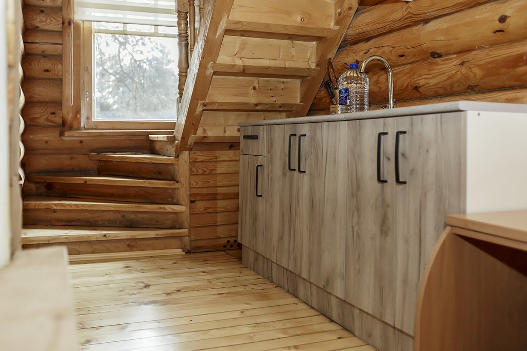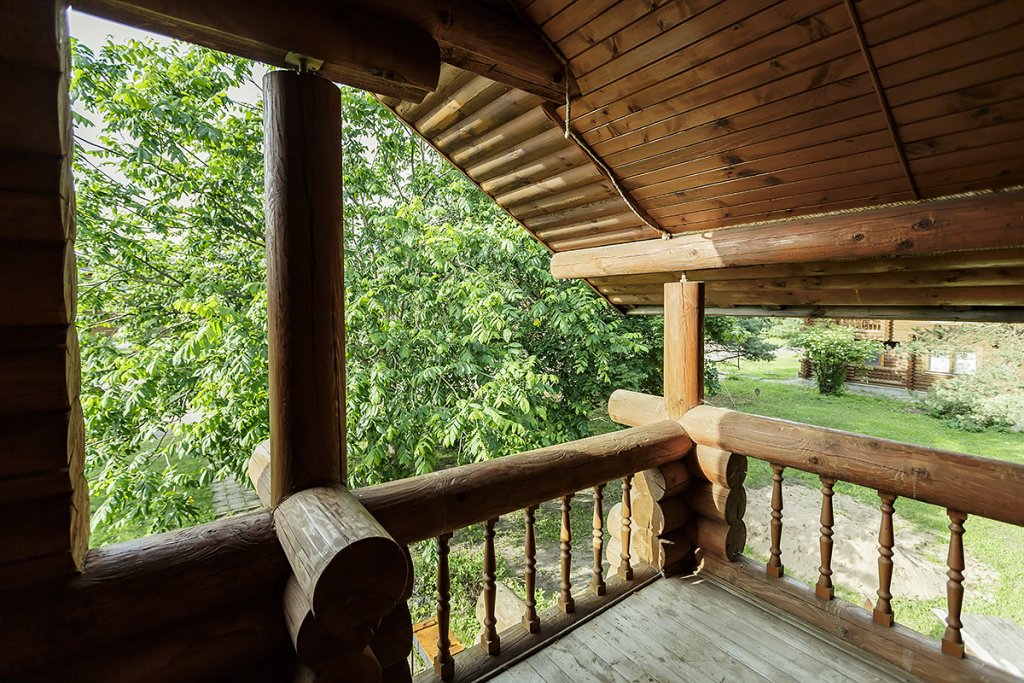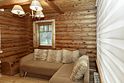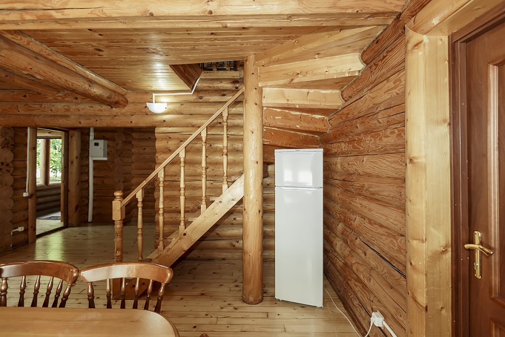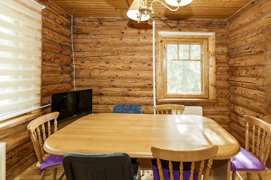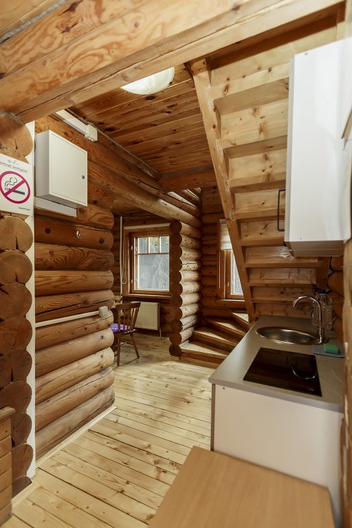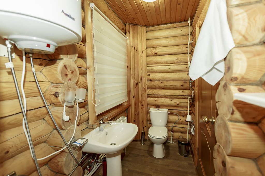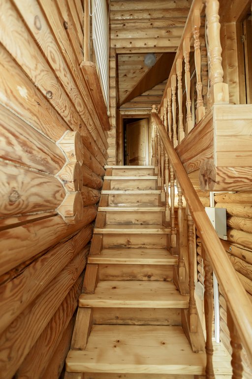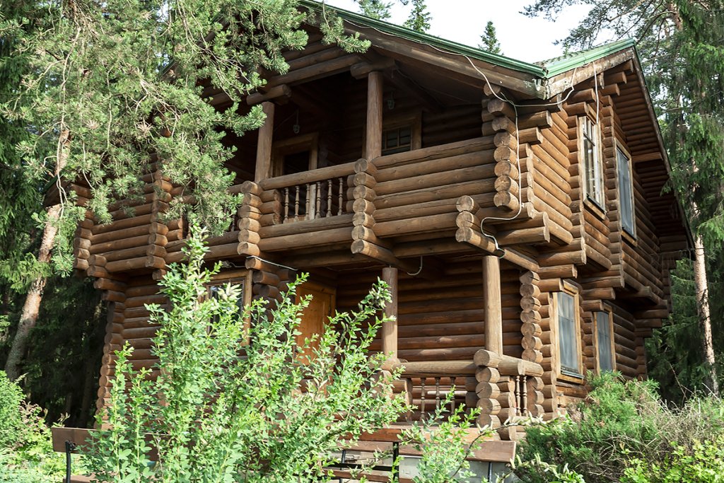 Деревянный коттедж из двух этажей с балконом, рассчитанный на 6-10 человек. В доме имеется кухня, два холла, два санузла, три спальни и балкон.