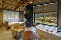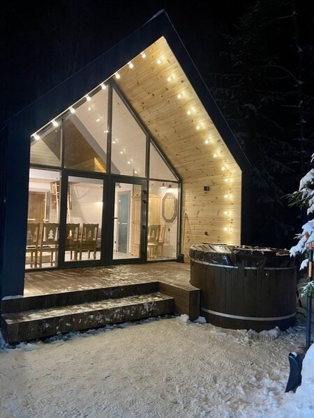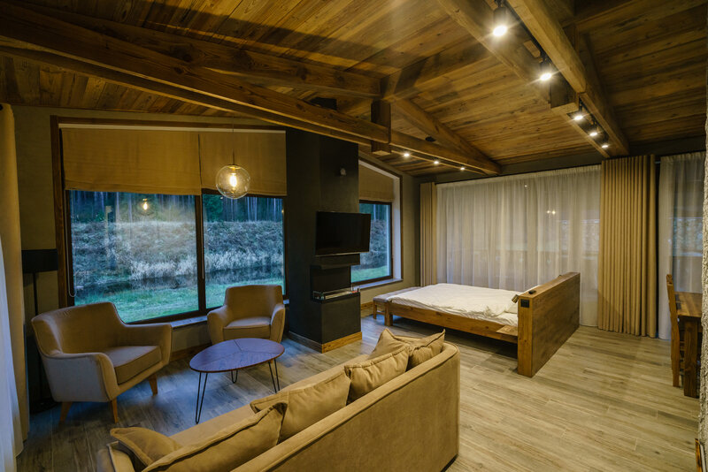 Путешествие с паройДом шале с джакузи - лучшийПотрясающий вид из панорамных окон, очень качественный ремонт, хорошая мебель, техника, есть все необходимое. На территории нет ресторана, но есть велосипеды. Угли для мангала лучше брать с собой, очень понравилось, домик с джакузи - топ! У реки есть шезлонги домики уединенные, но иногда вокруг дома ходят люди, хорошо, что есть шторы, потому что окна панорамные