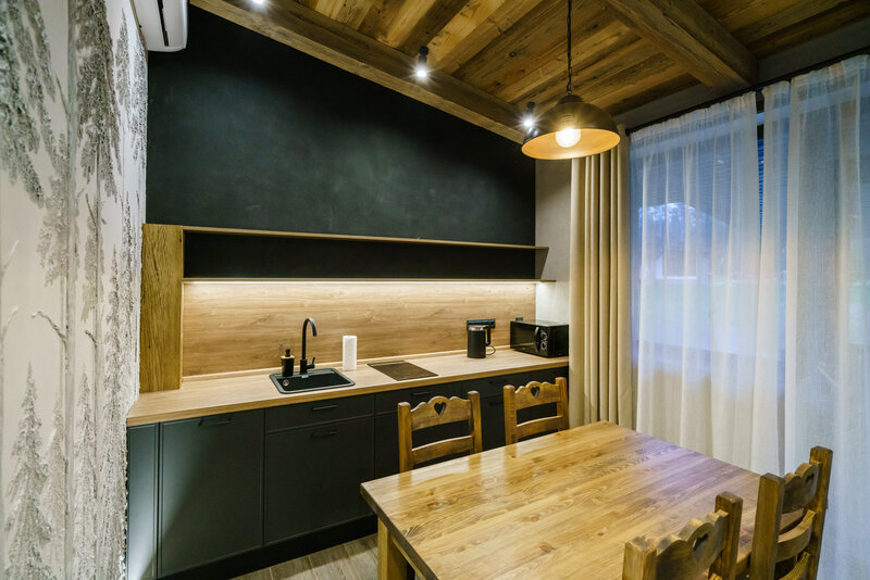 В нашем доме расположена функциональная кухня с мойкой, варочной панелью, посудомоечной машиной, СВЧ, электрическим чайником, холодильником и набором посуды. На кухне мы расположили обеденный стол на 4 персоны.
