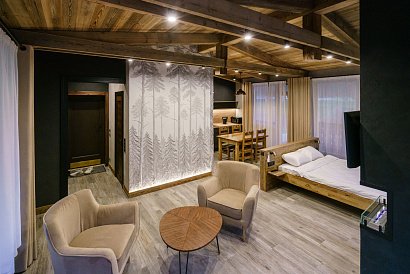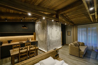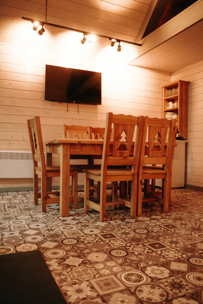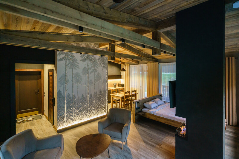 Дом имеет планировку студии и рассчитан на 4 спальных места. Интерьер студии максимально приближен к окружающей природе: вся мебель и предметы сделаны из дерева и экологичных материалов.