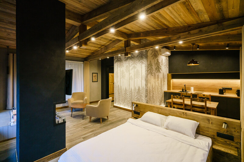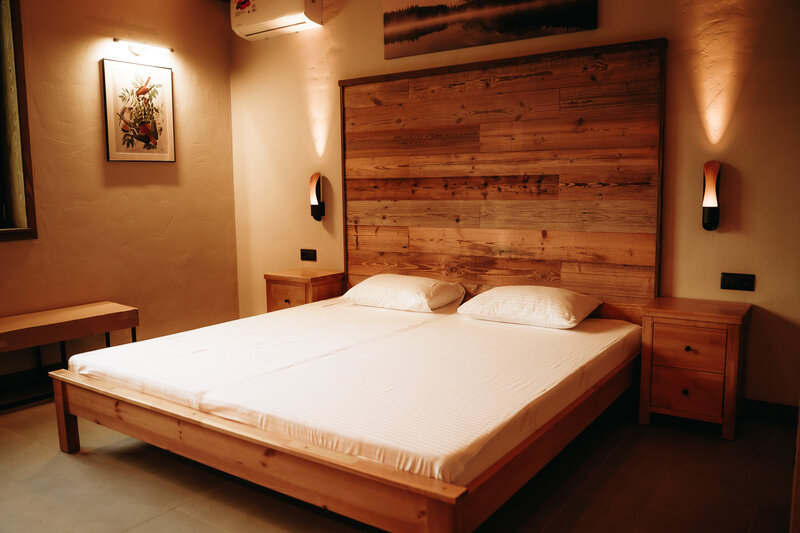 Дом имеет планировку студии и рассчитан на 2 спальных места. Интерьер студии максимально приближен к окружающей природе: вся мебель и предметы сделаны из дерева и экологичных материалов.