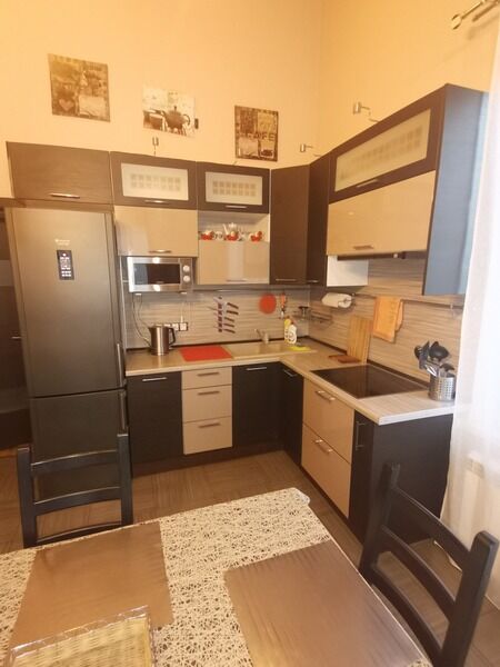 Гостиная: диван - при необходимости раскладывается в двуспальное место, телевизор - hd-каналы. Кухня со всей необходимой посудой, холодильник, микроволновая печь, варочная поверхность, чайник, духовка.