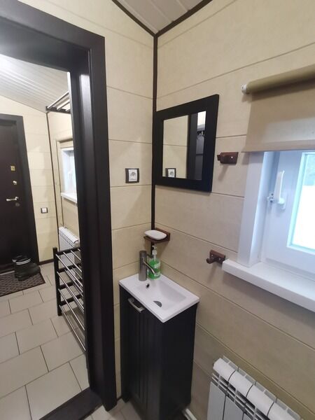 Два санузла: Основной санузел – душевая кабина, умывальник, унитаз с гигиеническим душем. Гостевой санузел – унитаз, раковина, зеркало.