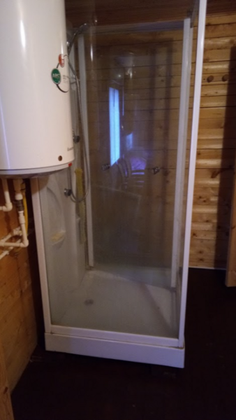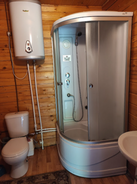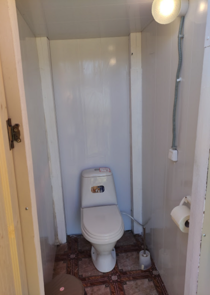 На улице установлен стол с холодной питьевой водой, отдельно стоящий туалет с унитазом и душем. (20 м)