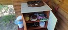 На открытой веранде установлен кухонный стол с газовой плиткой для самостоятельного приготовления блюд, необходимая посуда и пластиковые стол и стулья.
