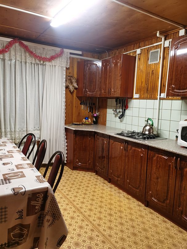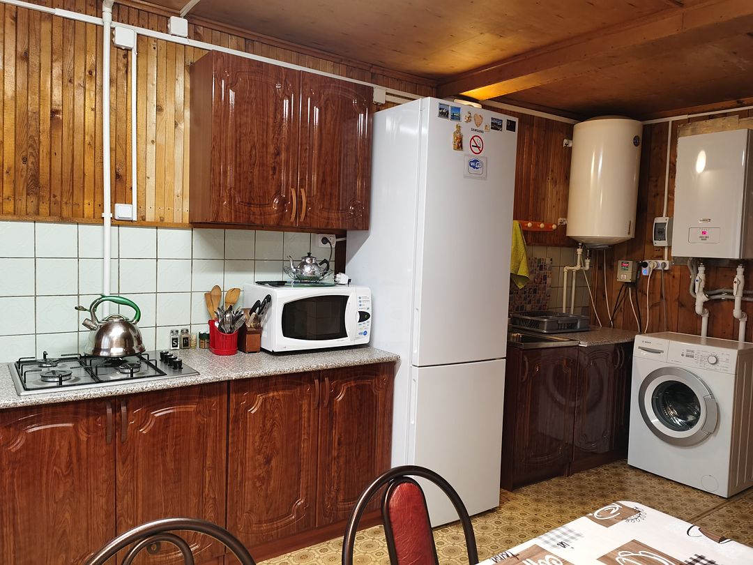 - Кухня 18кв.м ( большой холодильник, телевизор, газовая плита, микроволновка, стиральная машина, газовый котел, большой стол со стульями, полный набор посуды)