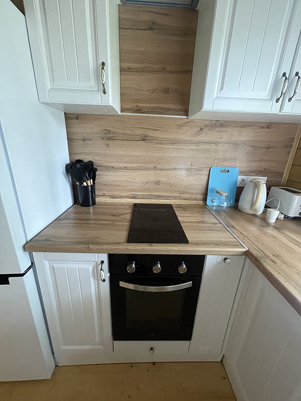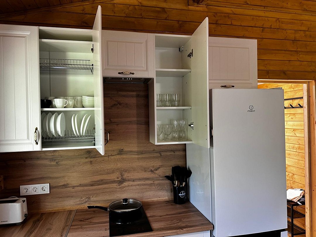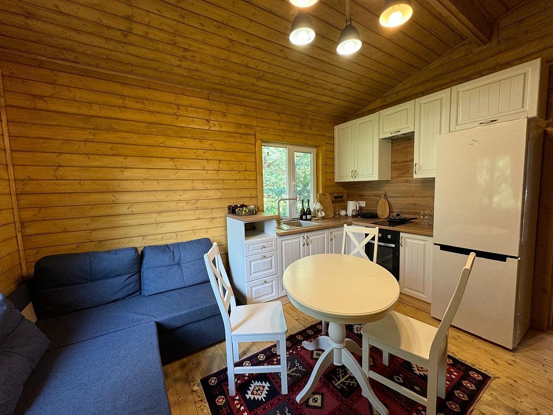 Кухня-гостиная с односпальными диваном оборудована всем необходимым для отдыха и приготовления пищи.