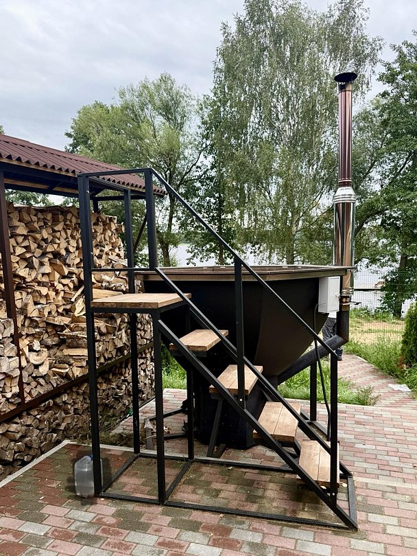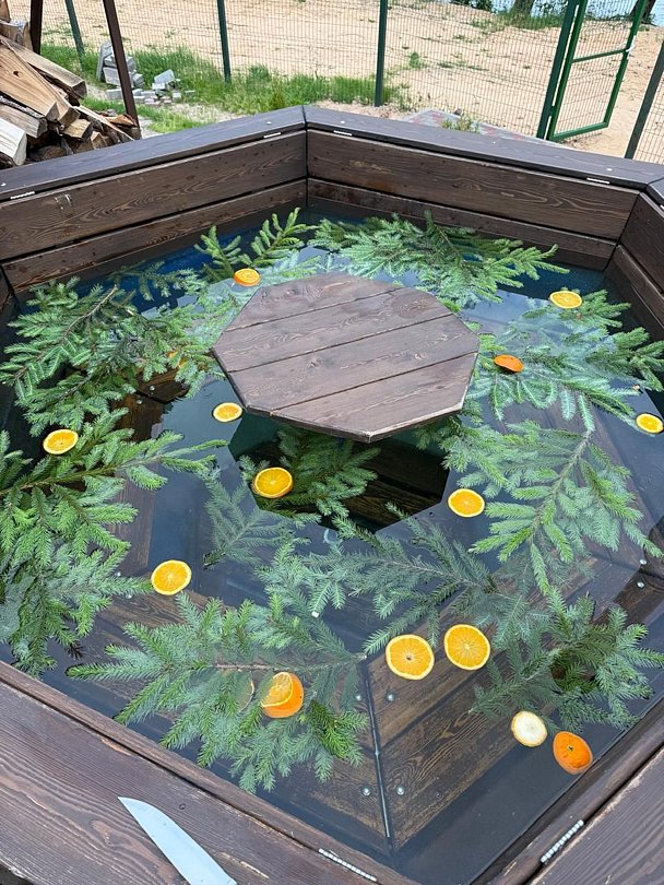 На берегу Волги расположен банный чан, предназначенный для парения на свежем воздухе. Для удобства гостей предусмотрены шапочки и полотенца, чтобы каждый мог насладиться процессом в полной мере.