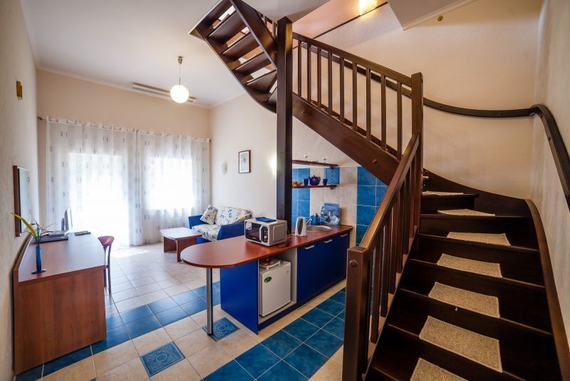 В номере на 1-м этаже: гостиная, кухонная зона, ванная комната. Общая терраса. На 2-м этаже: спальня. В спальне: двуспальная кровать. В гостиной: раскладной полутороспальный диван, ТВ. В кухонной зоне: мини-холодильник, набор посуды, микроволновая печь, электрический чайник, барная стойка. В ванной: душевая кабина, фен, туалет.