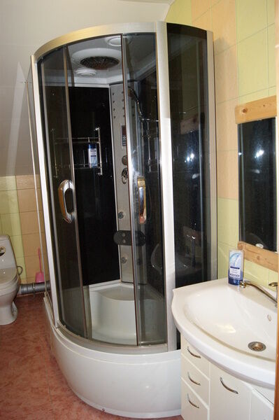 1й этаж: 4 спальни, 2 санузла (1 - туалет, раковина; 2 - душ, туалет, раковина), стол в холле + тв, миникухня (газовая плита, микроволновая печь, электрочайник, холодильник) с набором посуды. Незастекленная веранда