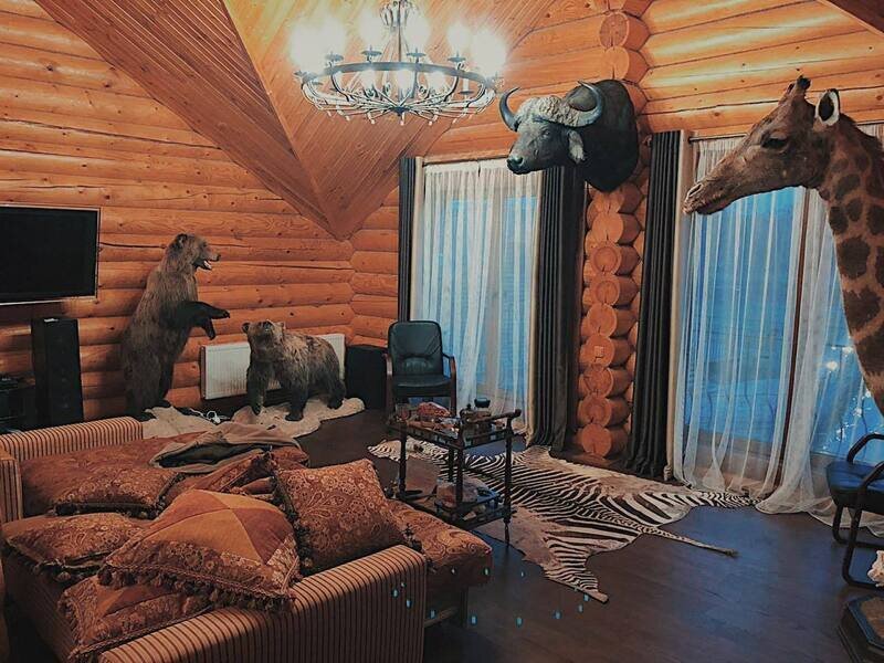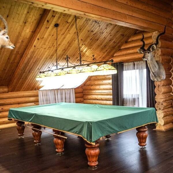 Рабочий кабинет с эксклюзивной мебелью в уникальном охотничьем стиле, просторная гостиная для вечерних посиделок и шумных торжеств, парковка, гараж на три автомобиля, газовое отопление, холодная и горячая вода.