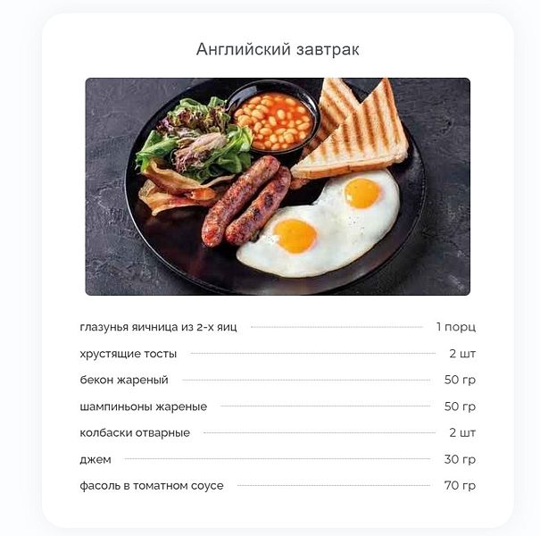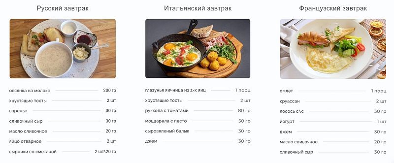 4 вида комплексных завтраков на выбор. Дополнительно можно заказать из основного меню по ценам ресторана.