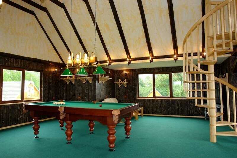Читать полностьюДвухэтажный банный комплекс с бильярдом и комнатой отдыха с камином: