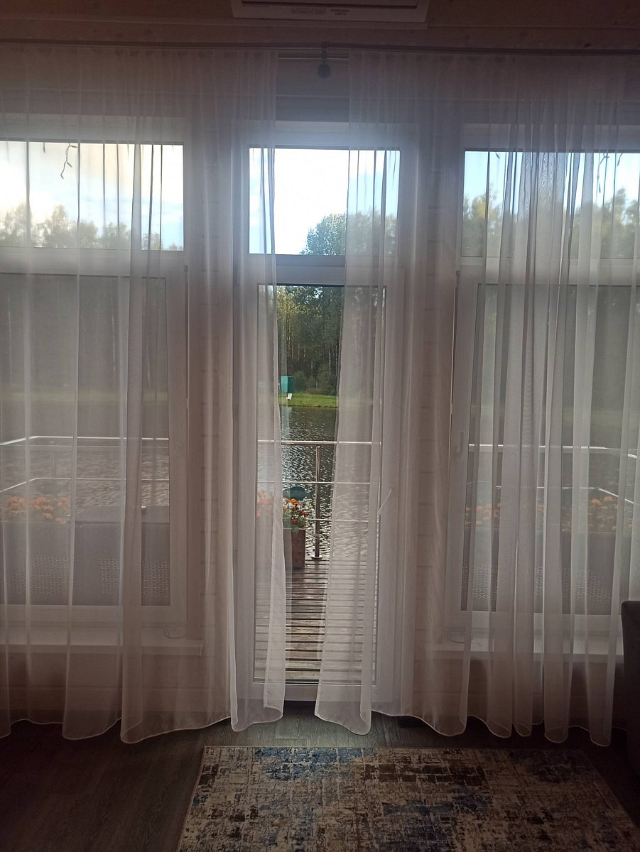 Уютная гостиная с панорамным остеклением, две кровати размером 90х200 см или одна двуспальная кровать 180х200 см с матрасами COMFORT PLUS , телевизором, обеденным столом со стульями, интернетом. Кухонный уголок оснащен электрической плиткой, чайником, набором посуды и приборов. Два выхода – центральный и на патио с видом на воду и доступом к рыбной ловле (платно/услуга предоставляется в летнее время). В ванной комнате: душ, туалет, косметические принадлежности, комплект полотенец, халаты и тапочки.