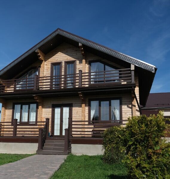 Дом из сруба с двумя этажами предлагает просторные спальни с большими окнами, две душевые комнаты, просторную столовую и общий зал.