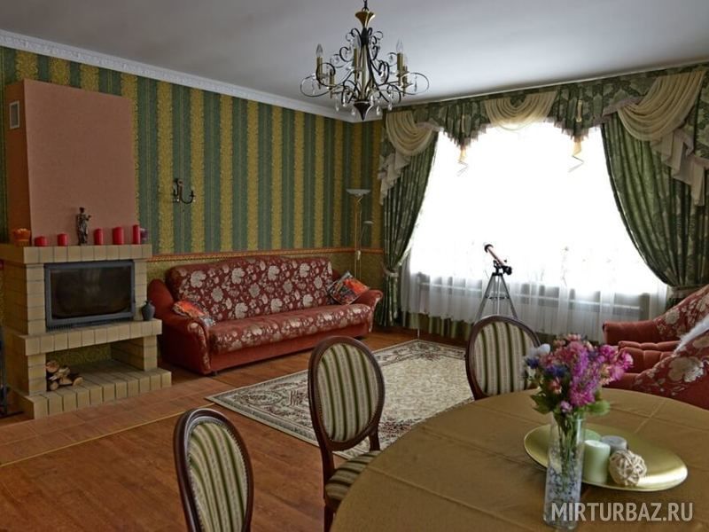 В доме есть все для полноценного отдыха за городом: пять спален (три спальни с двуспальными кроватями, и две спальни с двумя односпальными кроватями), просторная гостиная, крытая небольшая веранда с уличной мебелью и садовой качелью, полностью оборудованная кухня (электроплита, холодильник, СВЧ-печь, электрочайник, набор посуды), столовая с большим обеденным столом, два санузла, две душевые кабины, LCD-телевизор, комплект полотенец и комплект постельного белья для всех гостей домика. Идеальное сочетание комфорта и романтики. Рядом с коттеджем — оборудованная мангальная площадка с садовой мебелью и качелью на которых очень удобно отдыхать вечерами и ароматную готовить еду.