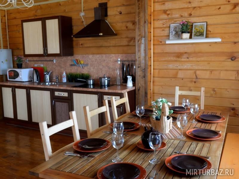 В коттедже 3 спальни с двуспальными кроватями (в одной спальне есть раскладывающийся диван) и 2 спальни с односпальными кроватями; просторная гостиная на первом этаже с камином, диваном, двумя уютными креслами, обеденным столом и стульями, LCD — телевизором и караоке; оборудованная кухня (электроплита, духовая печь, холодильник, набор необходимой посуды, стол, стулья, микроволновая печь); два санузла, две душевые кабины, комплект полотенец и постельного белья на всех гостей, небольшой холл с компьютерным столом, открытая большая веранда.