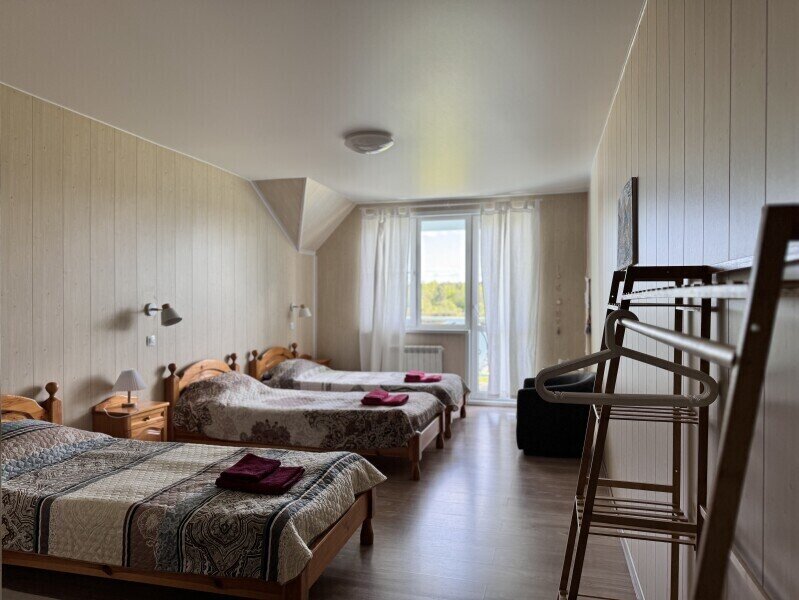 На втором 6 номеров с собственным санузлом, в каждом номере по три односпальные кровати. Комфортно может разместиться 18 человек.