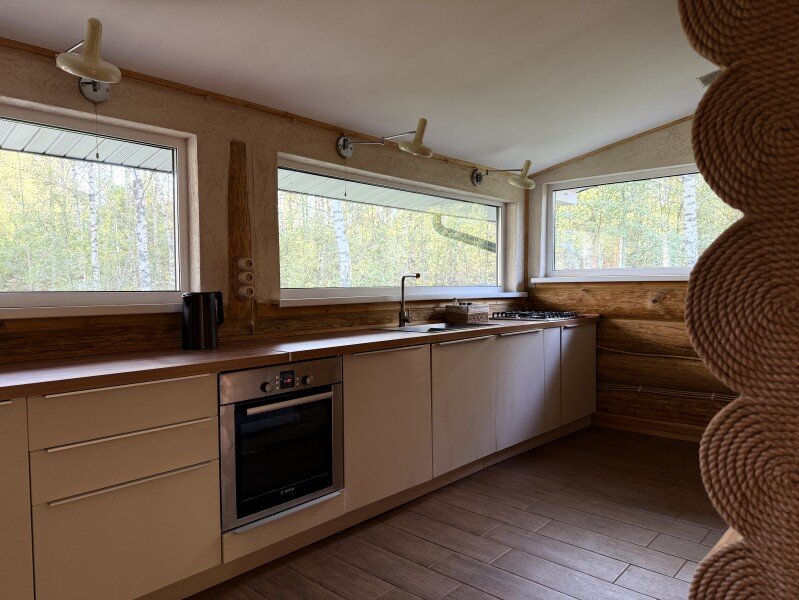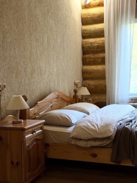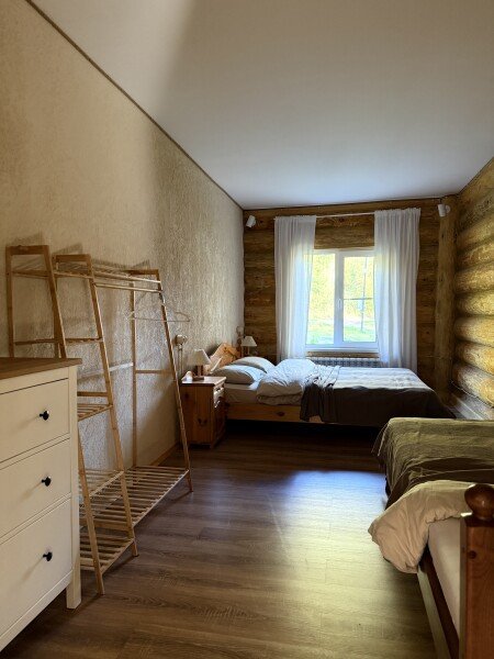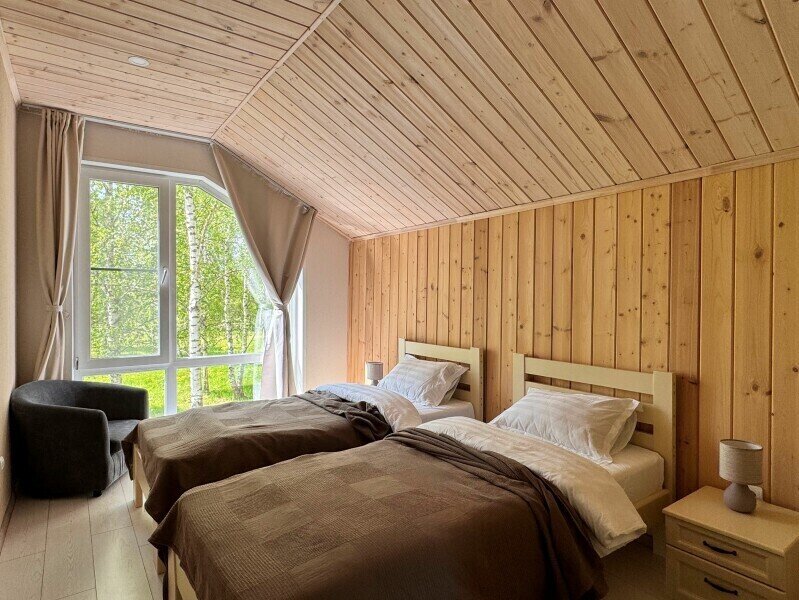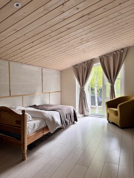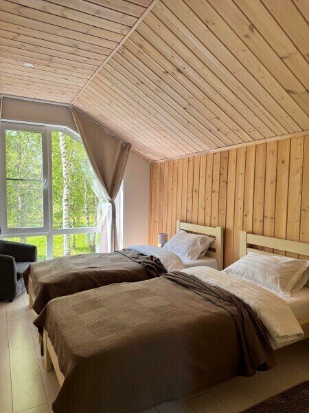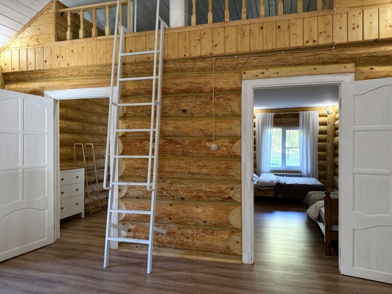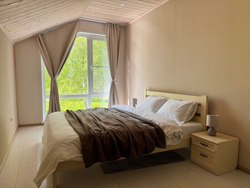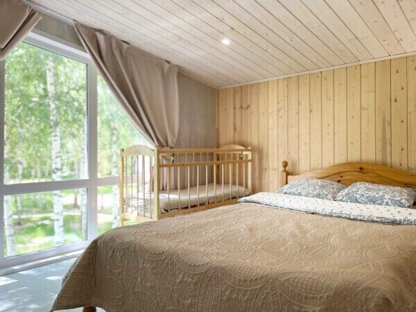 Двухкомнатный дом с мансардой 150 м² на семь человек. Мангальная зона у крыльца. Просторная гостиная с полностью оборудованной кухней, посудомоечная машина, духовка, ТВ и Wi-Fi. Ванная комната с душем, туалетом и раковиной. На втором этаже два матраца, на котором могут разместиться как дети, так и взрослые.
