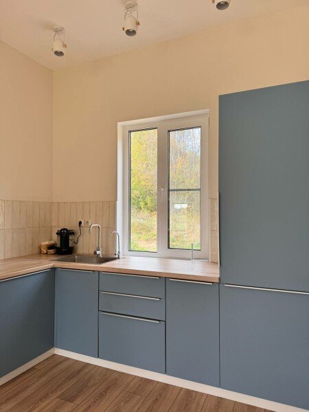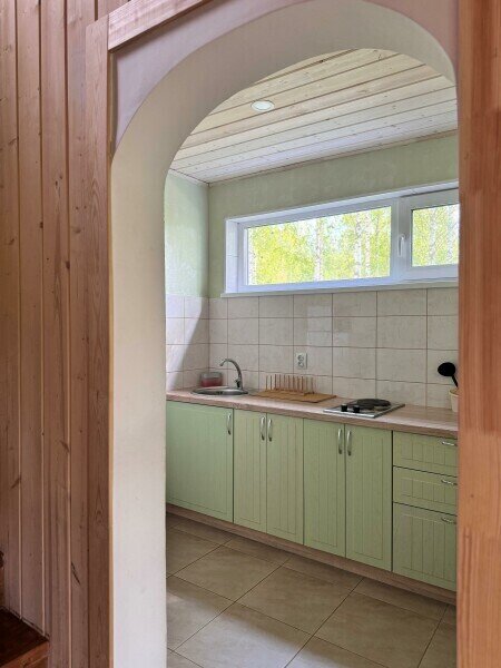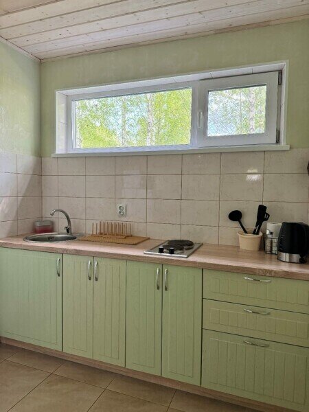 Дом 72 м2 на 4 человек. Мангальная зона у крыльца. Гостиная с полностью оборудованной кухней, ТВ и Wi-Fi и раскладным диваном (ширина 120). Ванная комната с душем, туалетом и раковиной. На втором этаже три односпальные кровати 90см.