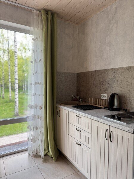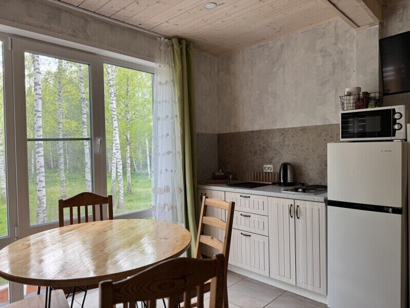 Дом площадью 72 м² вмещает четыре человека. Мангальная зона расположена у крыльца. Гостиная с полностью оборудованной кухней, телевизор, Wi-Fi и раскладной диван шириной сто двадцать сантиметров.