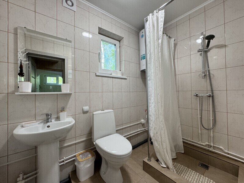 Дом 100 м2. Мангальная зона у крыльца. Гостиная с ТВ, Wi-Fi и раскладным диваном (ширина 140). Отдельная полностью оборудованная кухня. Ванная комната с душем, туалетом и раковиной. На втором этаже в одной спальне двуспальная кровать 160см, а во второй две односпальные 90см.