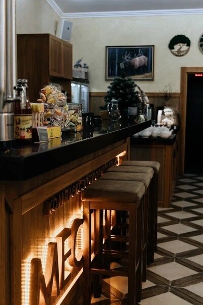 Интерьер, оформленный картинами ручной работы, люстрой из натуральных рогов и эко-мебелью, поражает своей самобытностью и вниманием к деталям. Расположившись у окон, Вы сможете насладиться изысканной кухней в окружении величественных деревьев, пения птиц и неповторимых образов природы, подарив себе незабываемые впечатления.