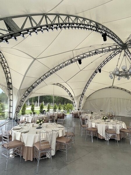 Просторный шатер площадью 260 квадратных метров с легкостью вместит до 300 гостей, став идеальной локацией для Вашего мероприятия любого формата — от ретрита до грандиозной свадьбы. Помимо основного зала, шатер включает в себя два дополнительных модуля по 50 квадратных метров каждый: один из них оборудован под кухню, а во втором располагается сцена для ведущего и диджея.