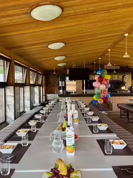 Уютная веранда загородного комплекса, расположенная в живописном уголке с чудесным видом на парк, будет идеальным местом для проведения мероприятия или отдыха в кругу друзей. Вместимостью до 60 человек, она оснащена профессиональной акустической системой с караоке, создавая комфортную атмосферу для Ваших гостей.