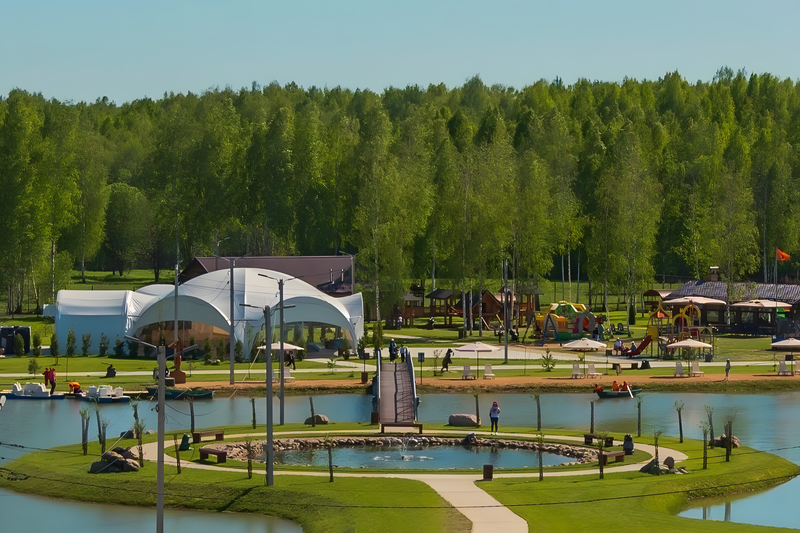 Читать полностьюЗагородный комплекс радует своих гостей живописным озером с песчаным пляжем, где можно с удовольствием отдохнуть всей семьей. Посетители могут наслаждаться теплом и комфортом, расположившись на удобных шезлонгах в любое время суток. Для большего удобства гостям предоставляются полотенца и раздевалки. Кроме того, комплекс оборудован зонтиками от солнца, гарантируя максимально комфортный отдых на пляже.