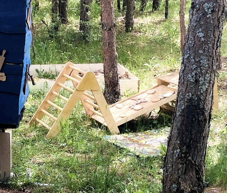 На территории обустроена детская площадка, которая уютно расположилась на полянке. Ее хорошо видно как с веранды, так и из окон дома — это позволяет родителям с комфортом наблюдать за играми детей.