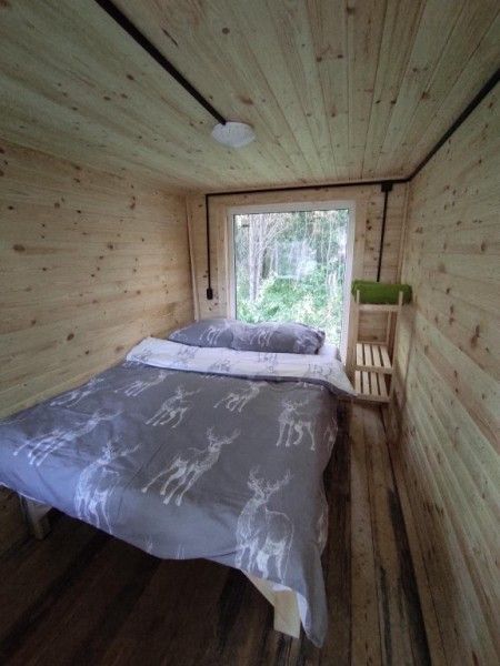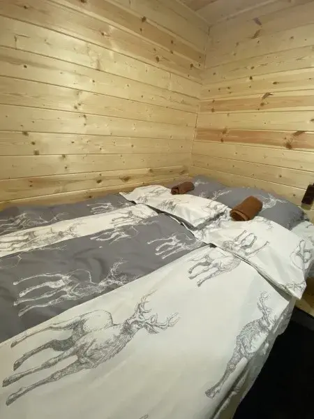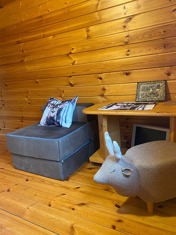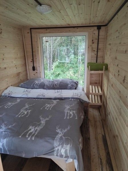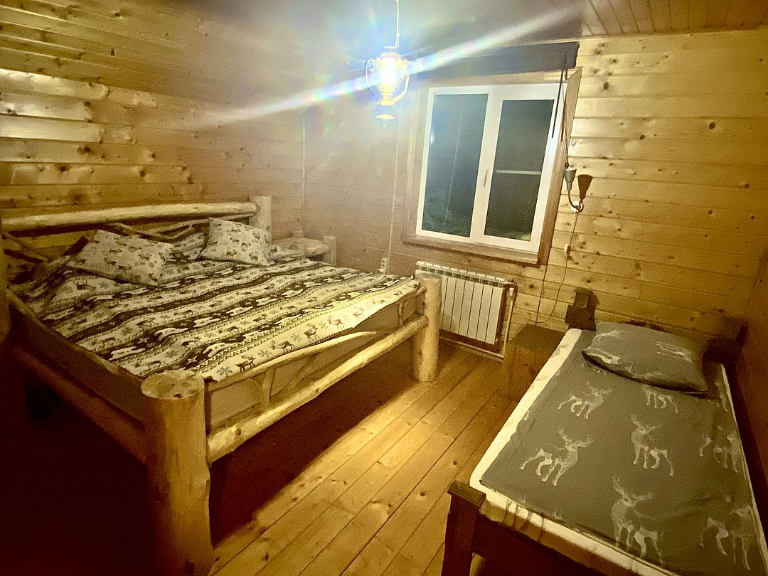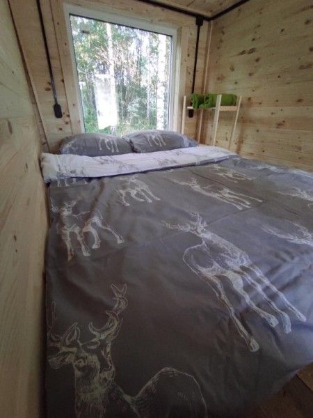 Отдельная комната в гостевом тереме на ферме с собственной ванной комнатой. Уютное постельное белье с оленями. Вид из окна на сосновый бор. Полное погружение в олений мир.