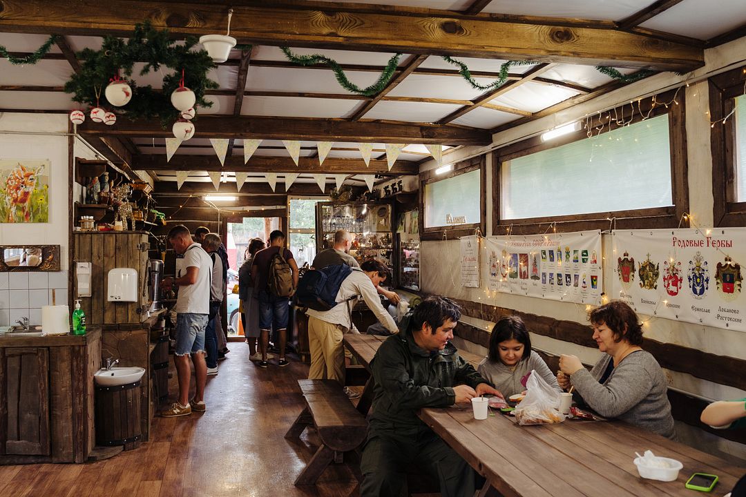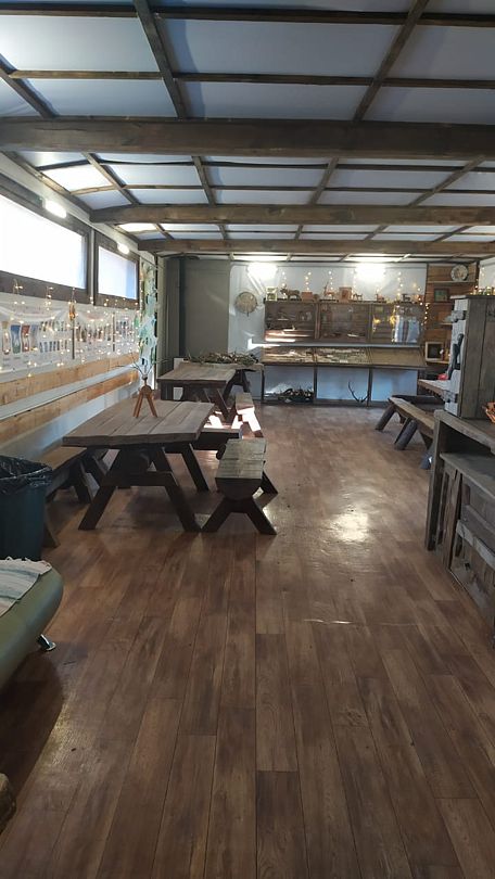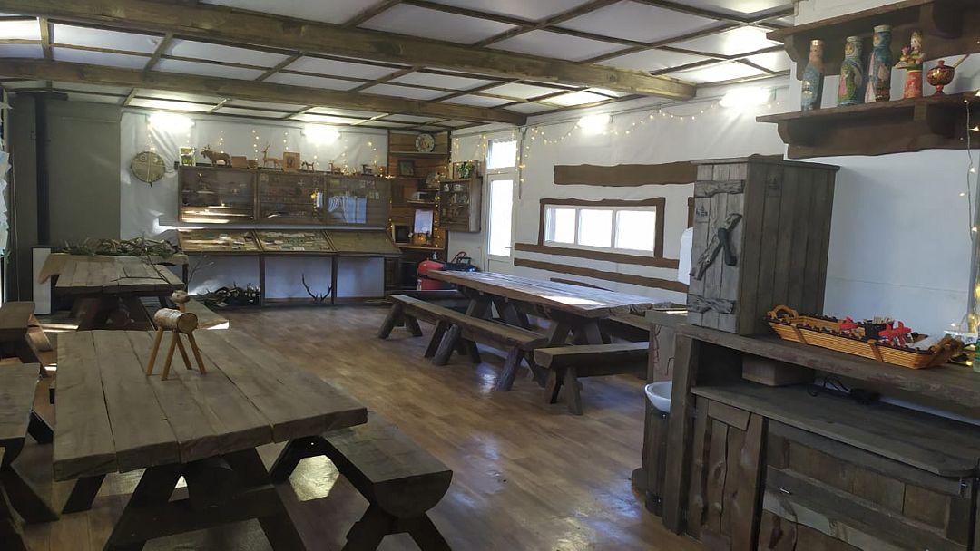 Столы, скамейки, электронагреватель воды на 60 чашек: кофе/чай, санузел, 3 раковины, 2 камина печки, мангальная зона на улице.