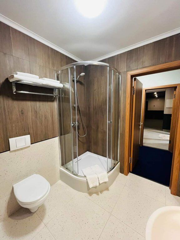 телевизор, Wi-Fi, кондиционер, светильник, фен, душевая кабина, санузел, халаты, банные полотенца, двуспальная кровать, шкаф для одежды, вешалки, журнальный столик, зеркало, пуфики, унитаз, ковровое покрытие, кулер на этаже, стул, тумба, внутренний телефон, телевизор с плоским экраном, мини-холодильник, без питомцевВ гостиничном номере