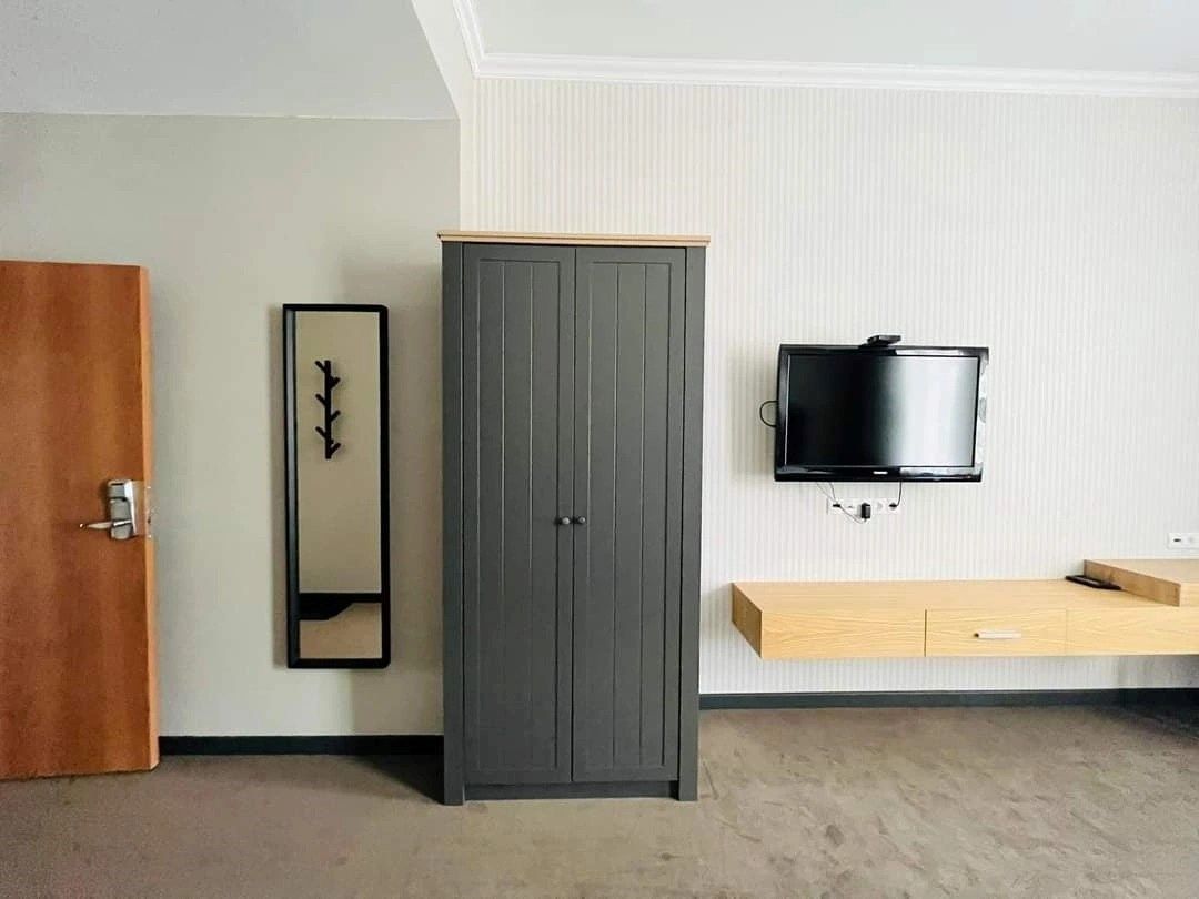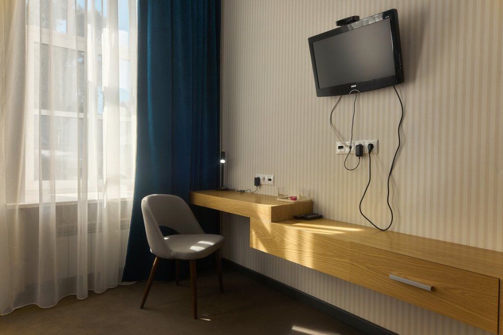 телевизор, Wi-Fi, кондиционер, светильник, фен, электронные замки, душевая кабина, санузел, халаты, двуспальная кровать, шкаф для одежды, зеркало, обслуживание номеров, унитаз, ковровое покрытие, кулер на этаже, высокие потолки, стаканы, стул, туалет, внутренний телефон, телевизор с плоским экраном, мини-холодильник, пуфик, рабочий стол, без питомцевВ гостиничном номере
