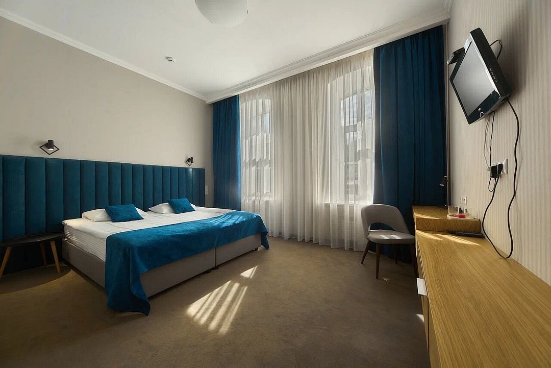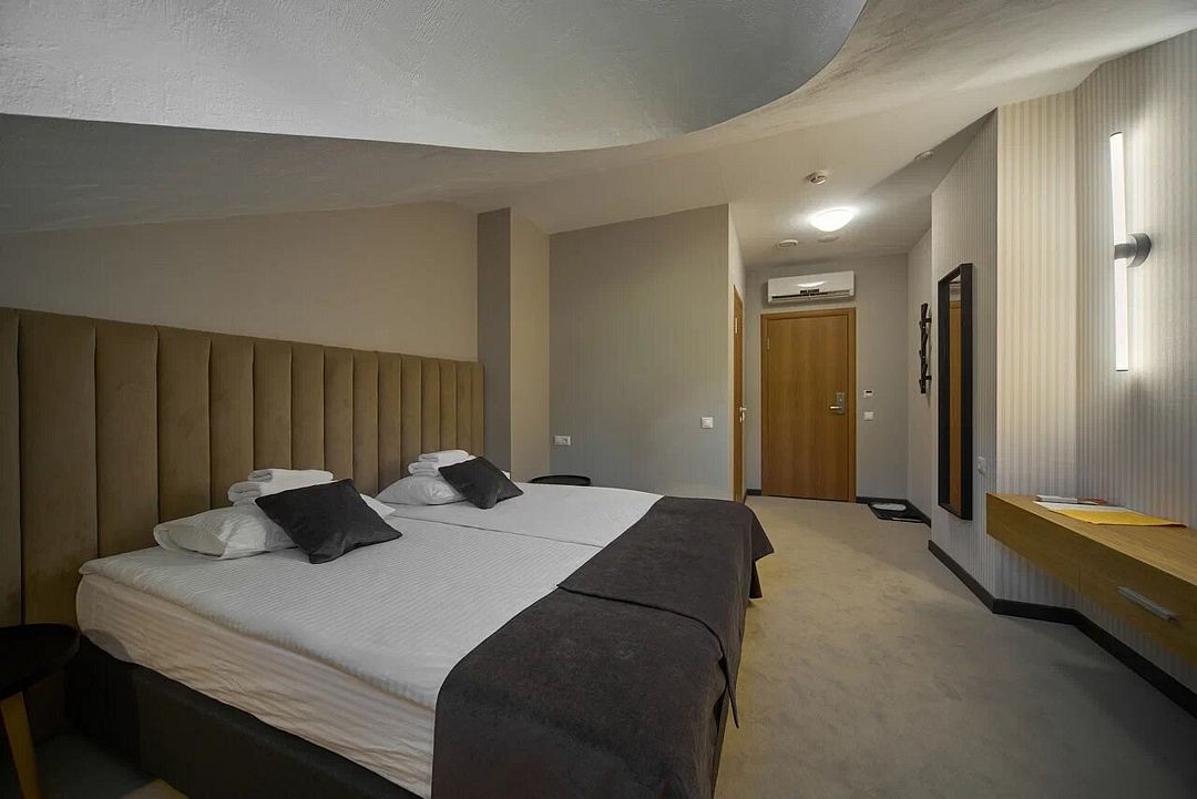 Двухместный номер с двуспальной кроватью. В номере: телевизор, холодильник, фен, санузел и душевая с мыльными принадлежностями. Номер оборудован кондиционером.Услуги и удобства
