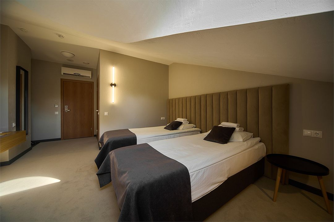 Двухместный номер с двумя отдельными кроватями. В номере: телевизор, холодильник, фен, санузел и душевая с мыльными принадлежностями. Номер оборудован кондиционером. Номер расположен на третьем этаже отеля (мансарда).Услуги и удобства