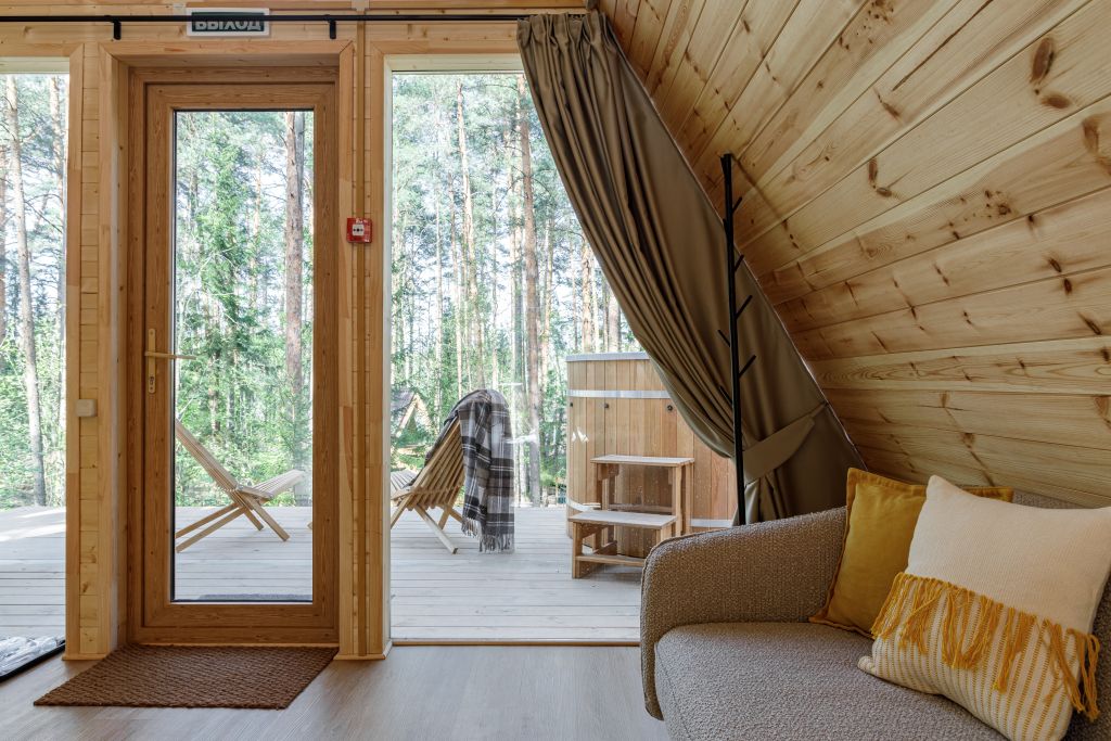Уютный лодж с панорамными окнами, где могут разместиться до 4 гостей. Дом оборудован всем необходимым для комфортного проживания. Есть терраса с удобными креслами, на террасе установлена подогреваемая купель-фурако.