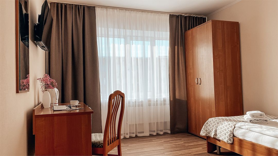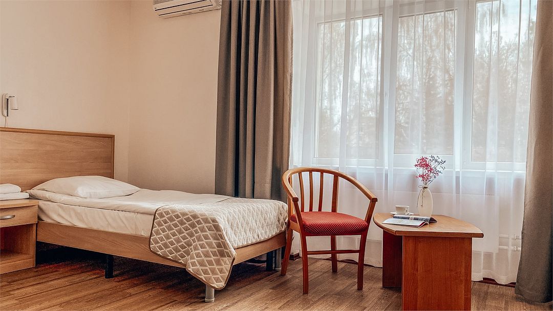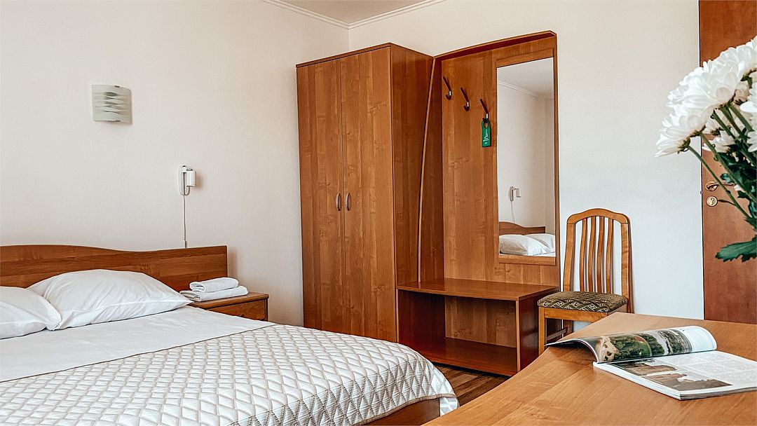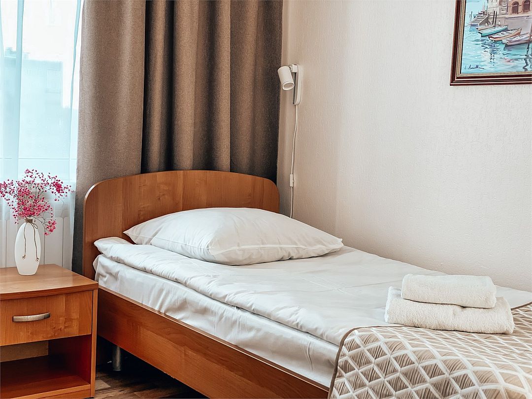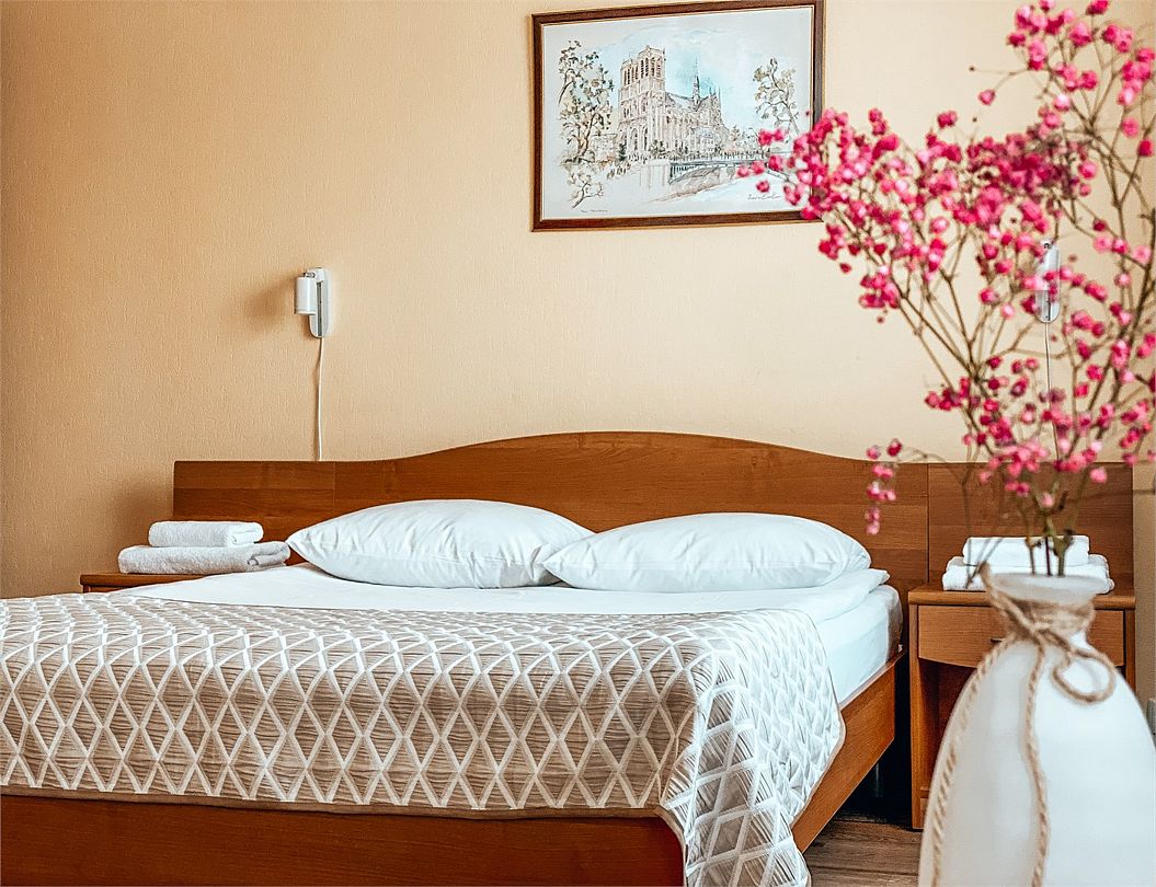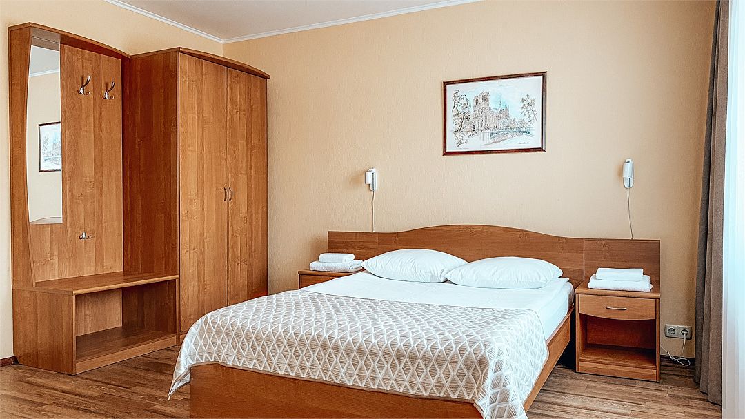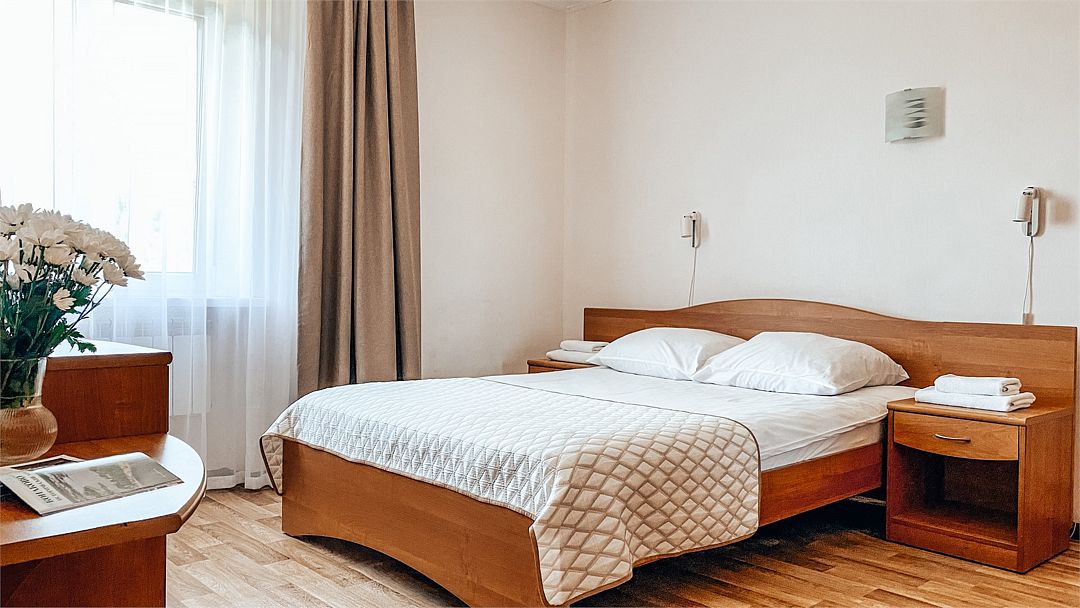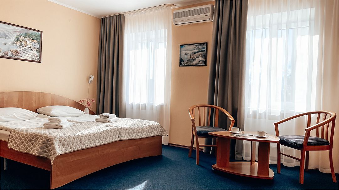 Пятиэтажный корпус отеля расположен на спокойной зеленой улице среди малоэтажной застройки. Гостей ожидают номера разной категории комфорта — Стандарт. Улучшенный, Семейный. В общей сложности жилой фонд готов принять 127 отдыхающих. В каждом номере есть индивидуальная ванная комната, телевизор, мини-холодильник, электрочайник.